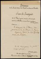 Χειρόγραφο καταστατικό της Εταιρείας Μελετών της Θαλασσίας Διώρυγος της Κορίνθου και συμφωνητικό μεταξύ των ιδρυτών G. Piat και Μ. Chollet και των μαρκησίων de Ploeuc και Argence.