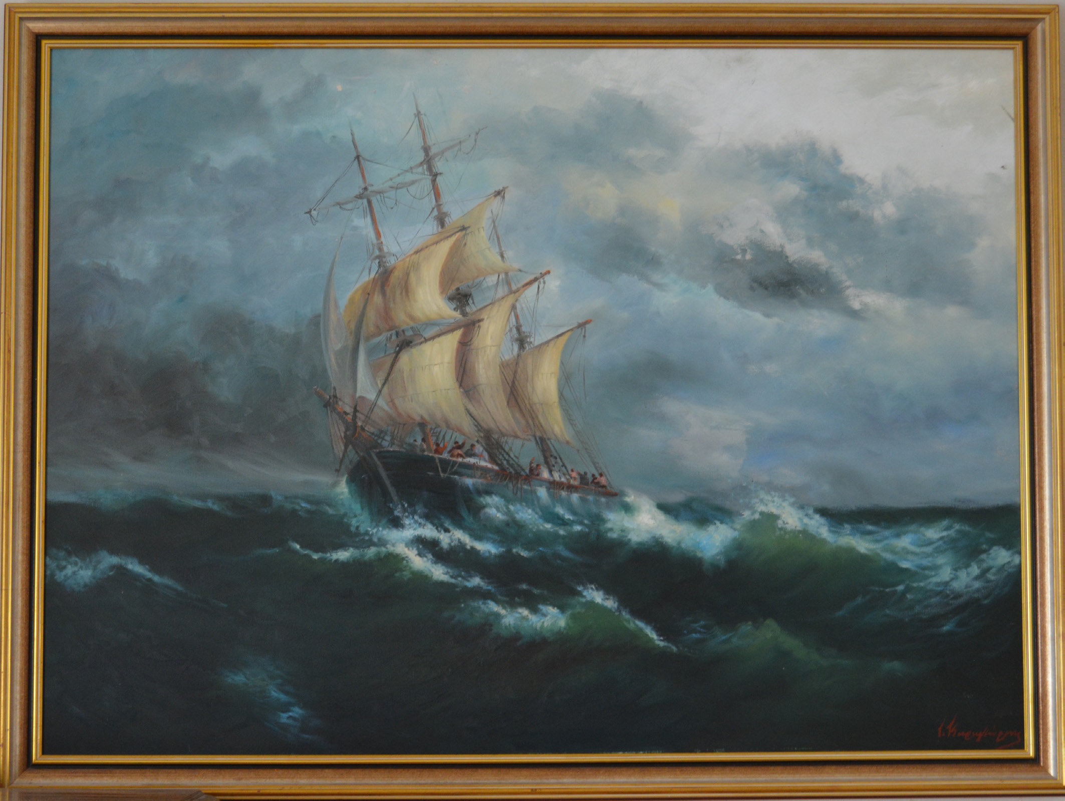 - Θαλασσογραφία που απεικονίζεται πλοίο σε θάλασσα του δημιουργού Γεωργίου Καραγεώργη.