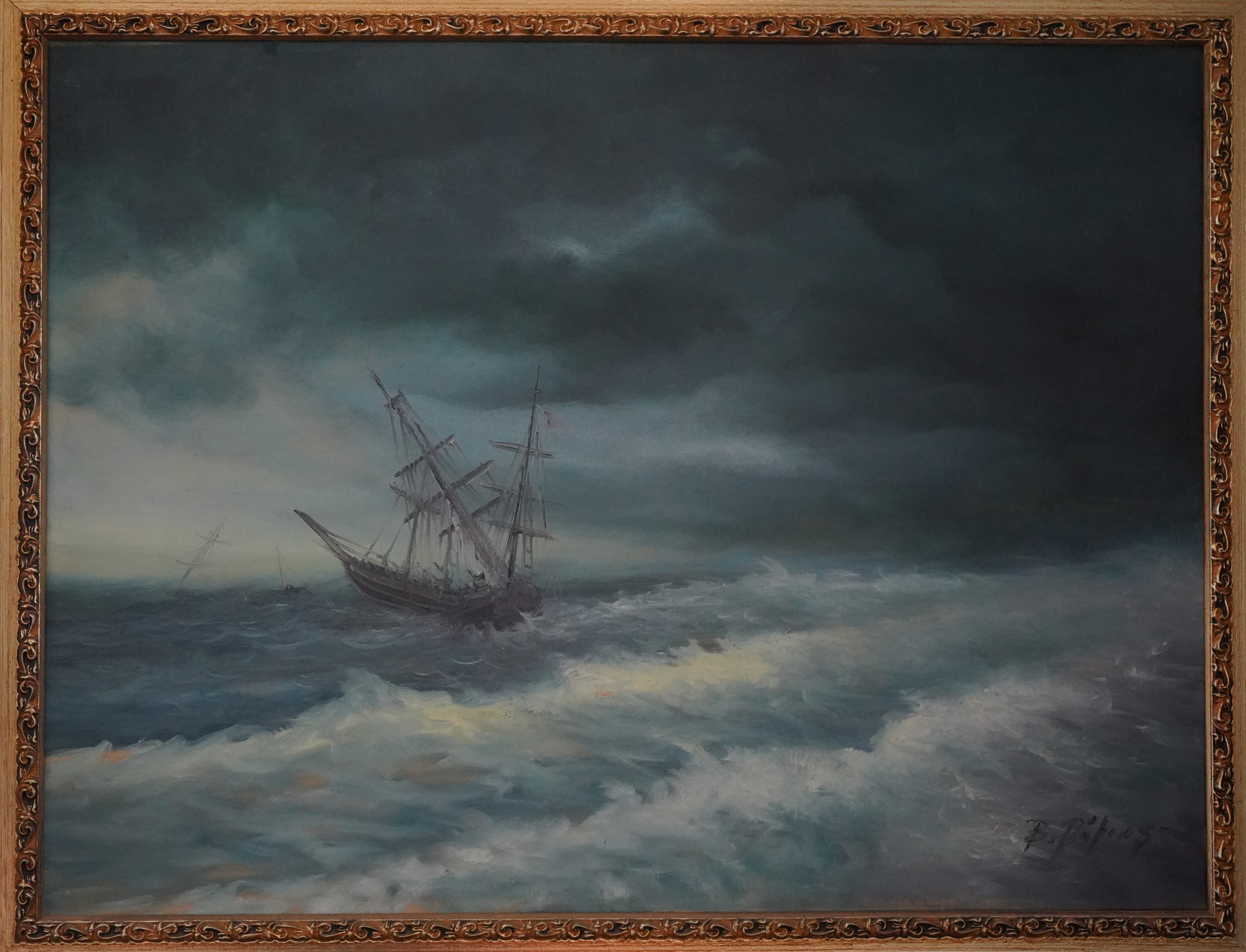 Θαλασσογραφία που δείχνει πλοίο ανάμεσα σε κύματα.