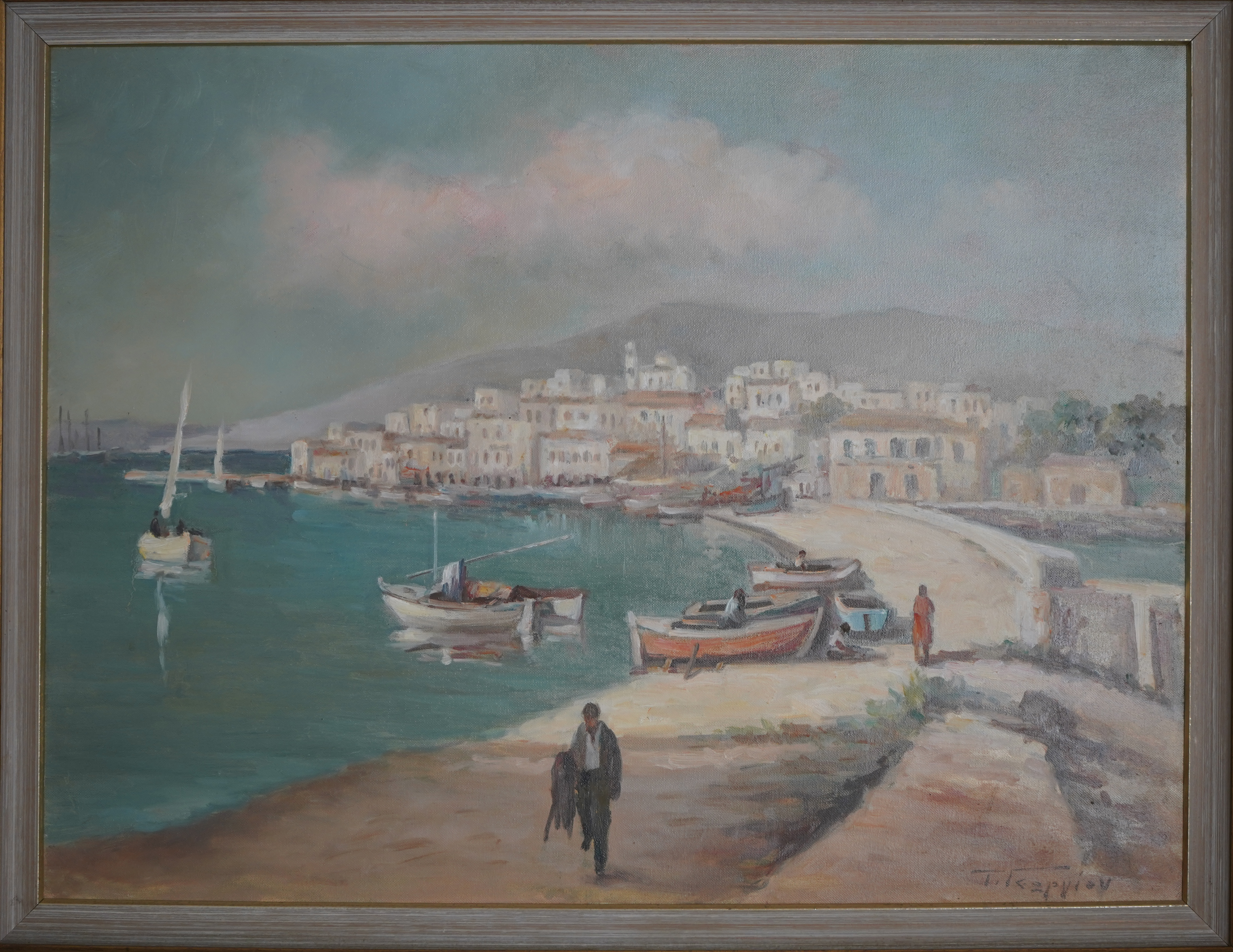 - Θαλασσογραφία που απεικονίζονται άνθρωποι, βάρκες σε λιμάνι ενώ στο βάθος φαίνεται μια πόλη. Δημιουργήθηκε από τον Τ. Γεωργίου.