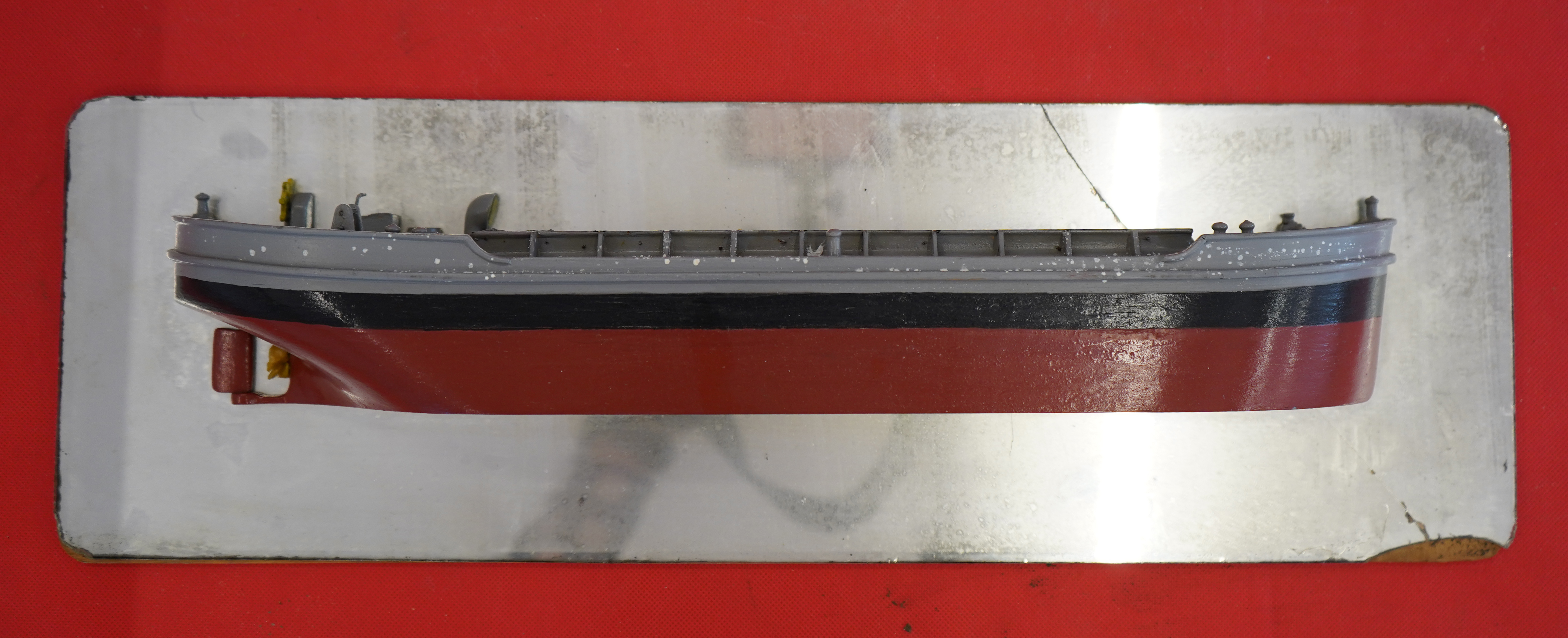 - Ξύλινο ημίτομο φορτηγίδας ΠΕΛΟΠΟΝΝΗΣΟΣ, μέσα σε προθήκη από μέταλλο και γυαλί με ξύλινη βάση.