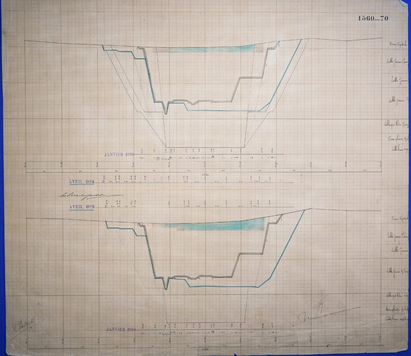 - Έγχρωμο σχέδιο προόδου εκσκαφικών εργασιών (μηκοτομή) χιλ. σημείου 1560-70 με μελάνι και έγχρωμο μολύβι σε χαρτί μιλιμετρέ.