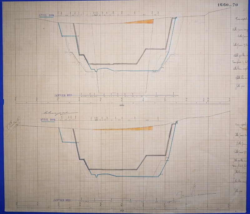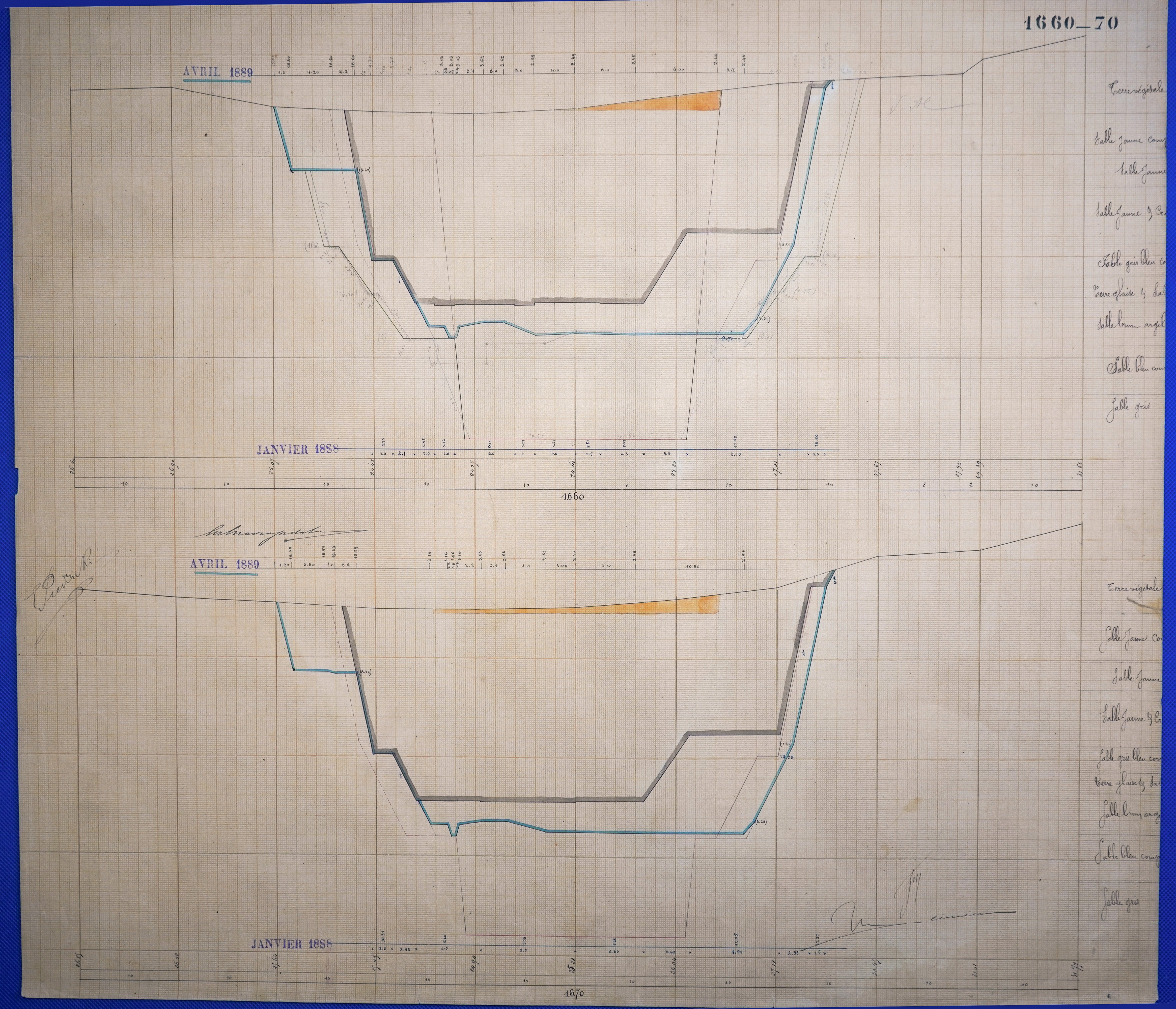 - Έγχρωμο σχέδιο προόδου εκσκαφικών εργασιών (μηκοτομή) χιλ. σημείου 1660-70 με μελάνι και έγχρωμο μολύβι σε χαρτί μιλιμετρέ.