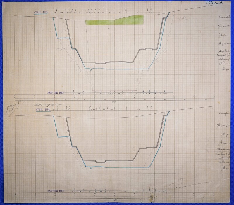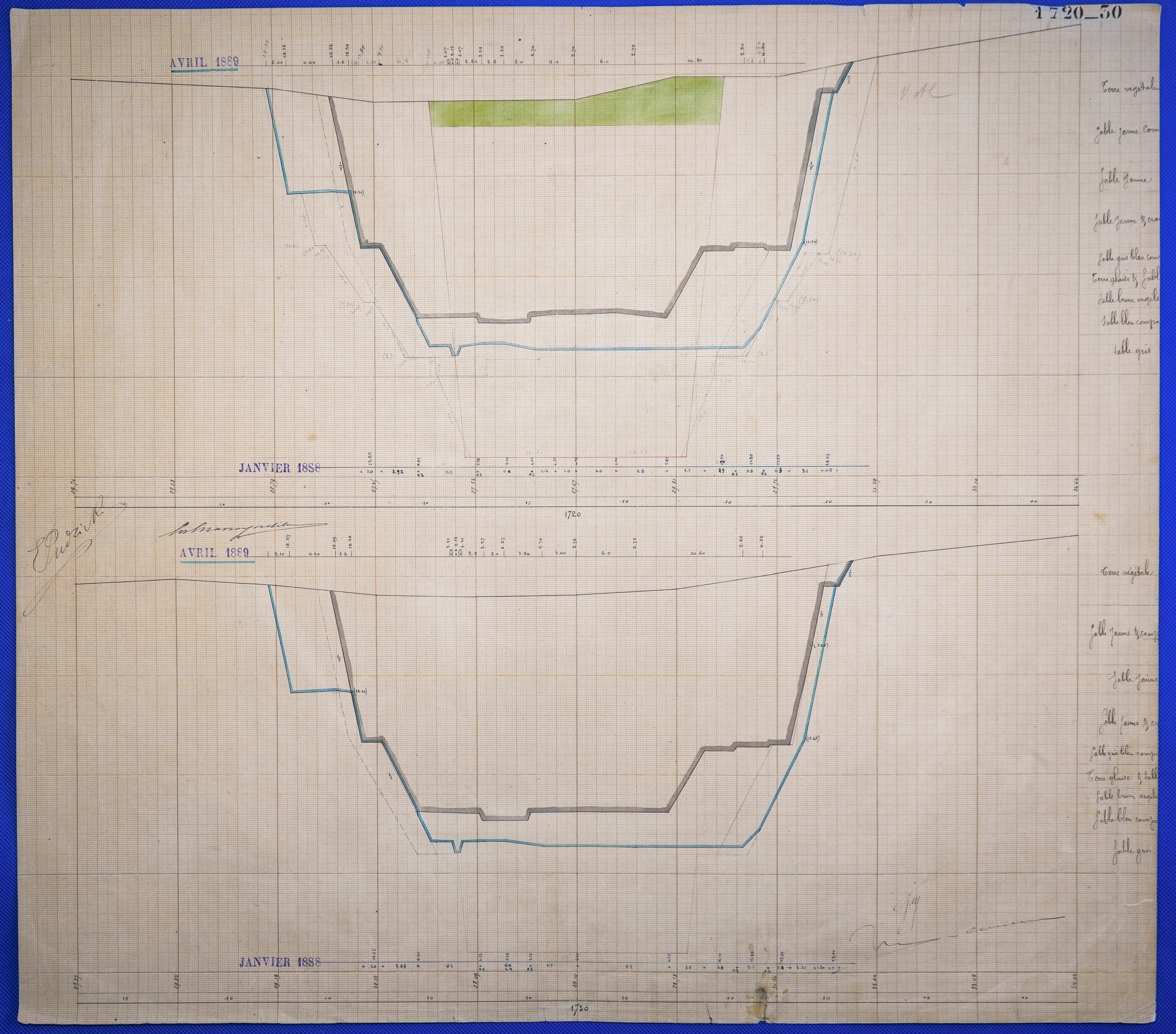- Έγχρωμο σχέδιο προόδου εκσκαφικών εργασιών (μηκοτομή) χιλ. σημείου 1720-30 με μελάνι και έγχρωμο μολύβι σε χαρτί μιλιμετρέ.