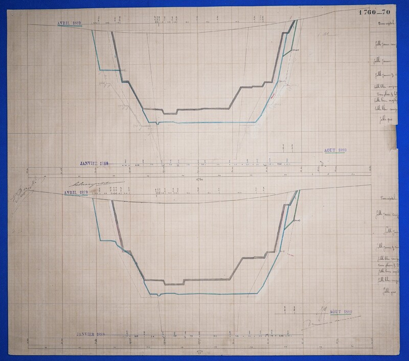 - Έγχρωμο σχέδιο προόδου εκσκαφικών εργασιών (μηκοτομή) χιλ. σημείου 1760-70 με μελάνι και έγχρωμο μολύβι σε χαρτί μιλιμετρέ.