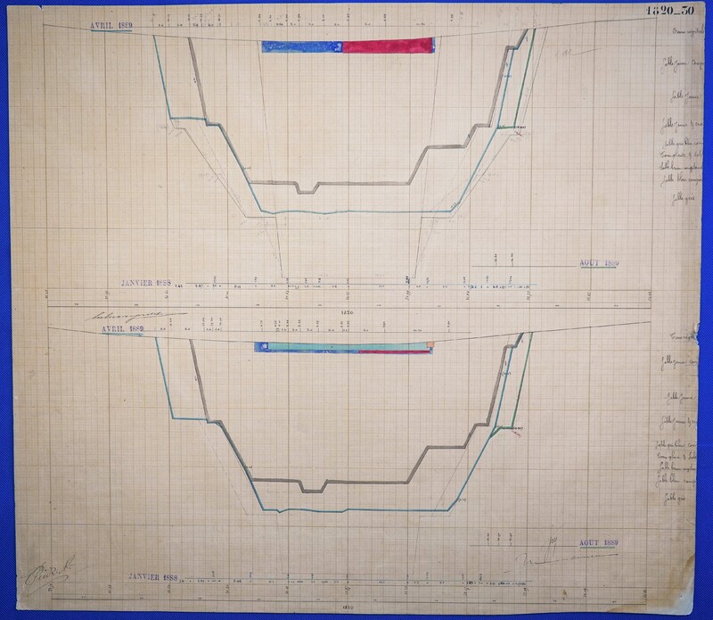 - Έγχρωμο σχέδιο προόδου εκσκαφικών εργασιών (μηκοτομή) χιλ. σημείου 1820-30 με μελάνι και έγχρωμο μολύβι σε χαρτί μιλιμετρέ.
