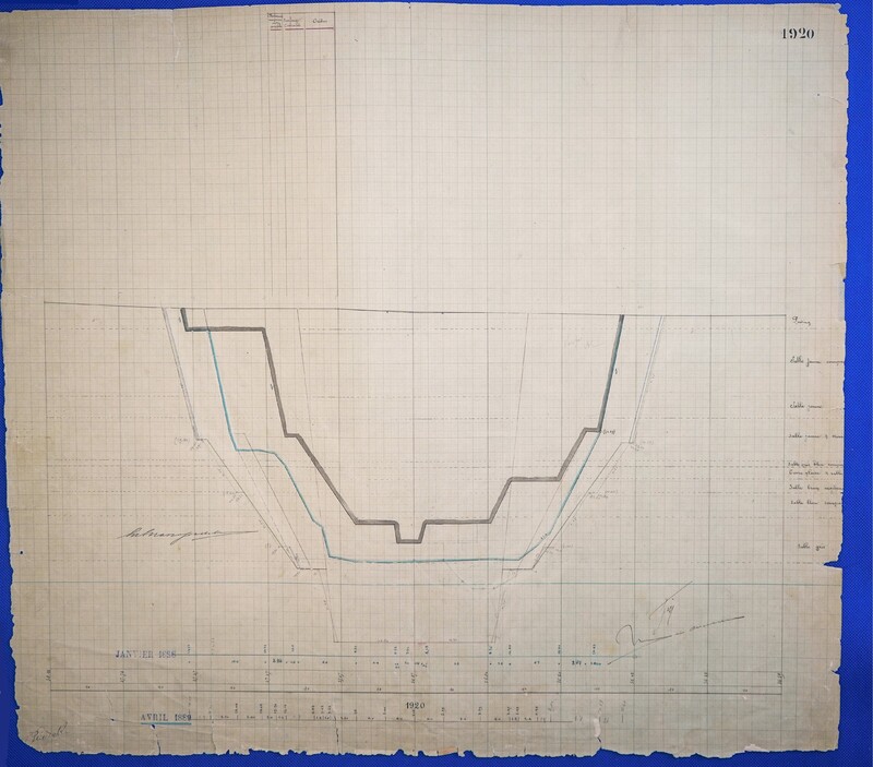 - Έγχρωμο σχέδιο προόδου εκσκαφικών εργασιών (μηκοτομή) χιλ. σημείου 1920 με μελάνι και έγχρωμο μολύβι σε χαρτί μιλιμετρέ.