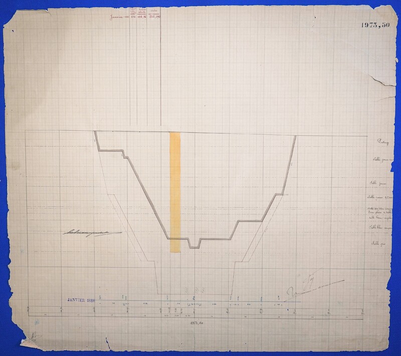 - Έγχρωμο σχέδιο προόδου εκσκαφικών εργασιών (μηκοτομή) χιλ. σημείου 1973,5 με μελάνι και έγχρωμο μολύβι σε χαρτί μιλιμετρέ.