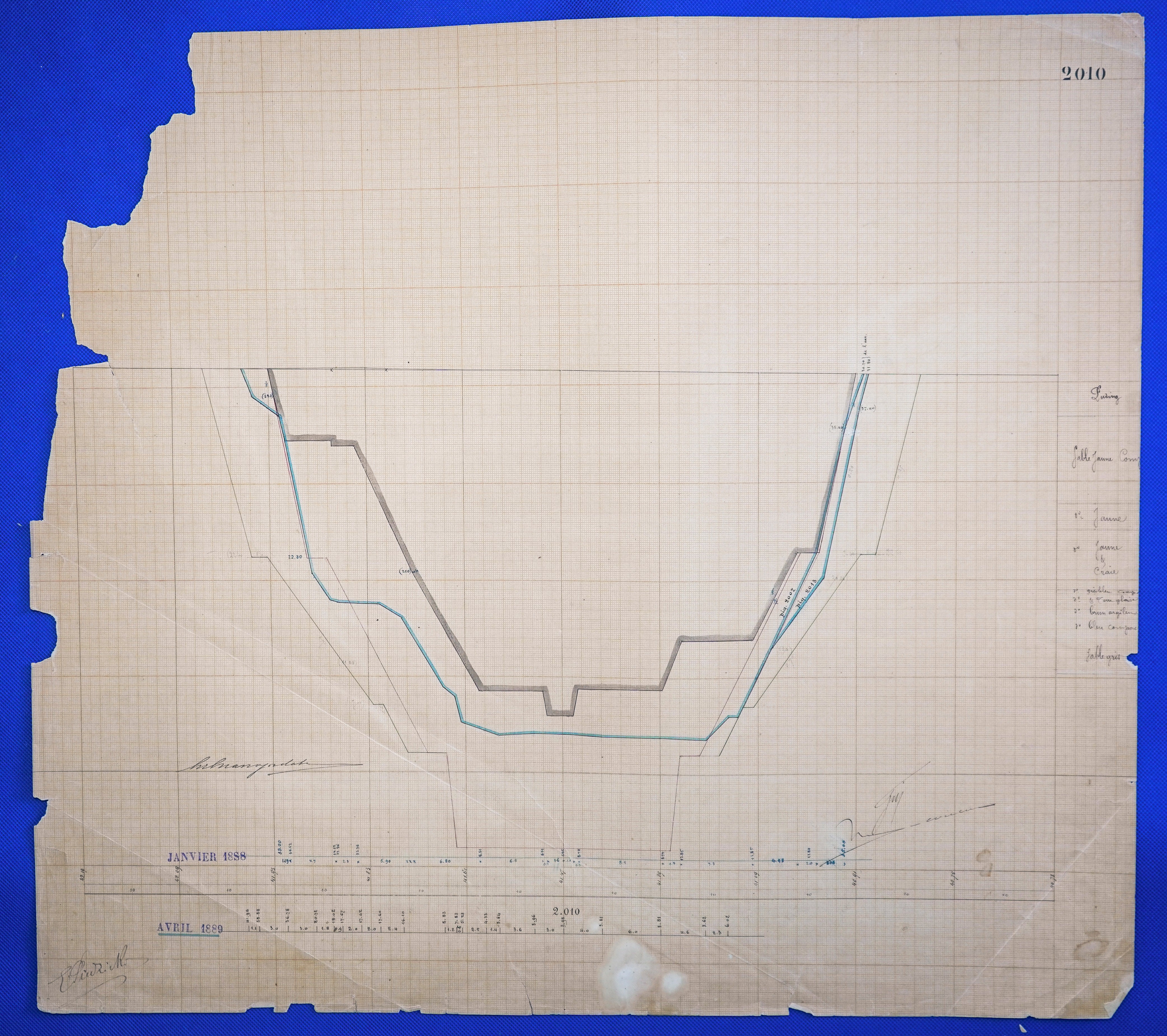 - Έγχρωμο σχέδιο προόδου εκσκαφικών εργασιών (μηκοτομή) χιλ. σημείου 2010 με μελάνι και έγχρωμο μολύβι σε χαρτί μιλιμετρέ.