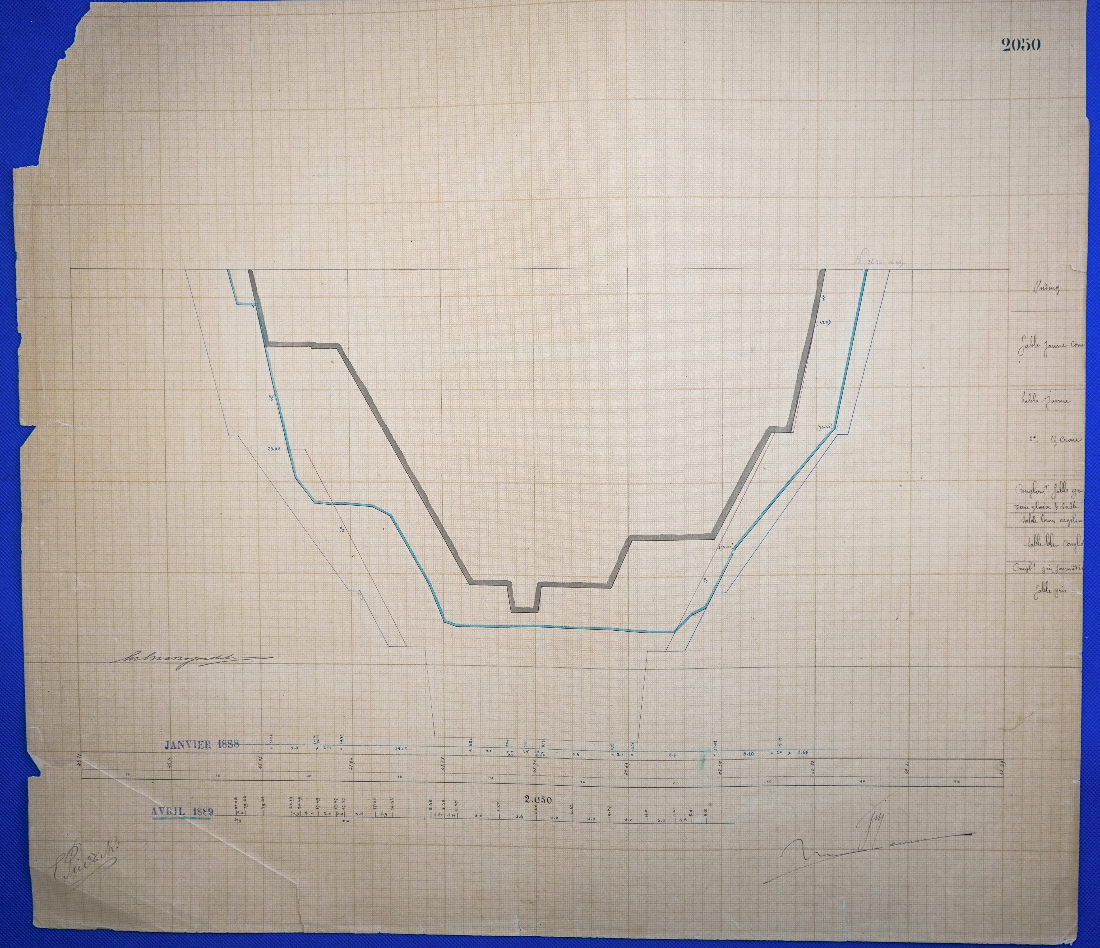 - Έγχρωμο σχέδιο προόδου εκσκαφικών εργασιών (μηκοτομή) χιλ. σημείου 2050 με μελάνι και έγχρωμο μολύβι σε χαρτί μιλιμετρέ.