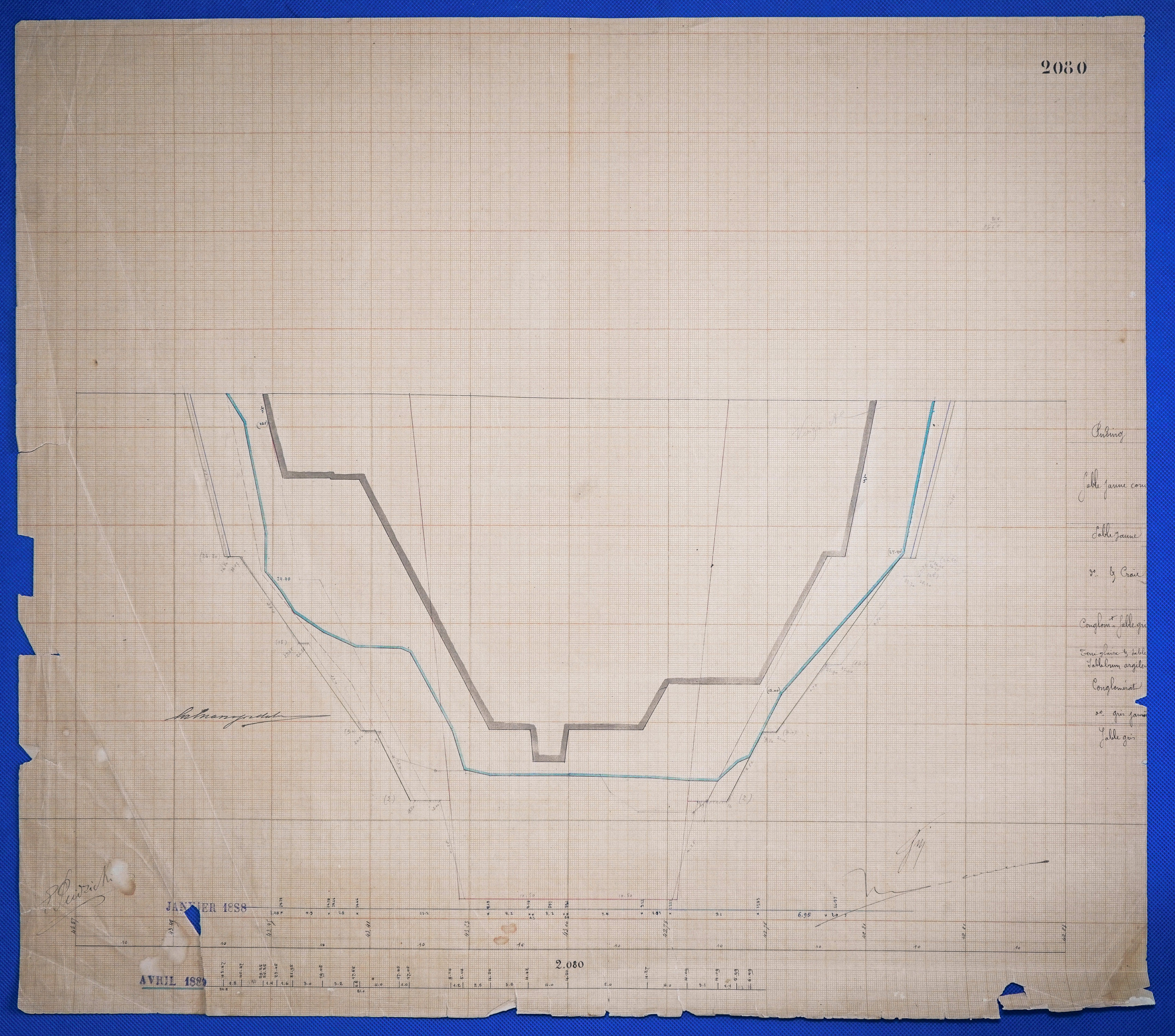 - Έγχρωμο σχέδιο προόδου εκσκαφικών εργασιών (μηκοτομή) χιλ. σημείου 2080 με μελάνι και έγχρωμο μολύβι σε χαρτί μιλιμετρέ.
