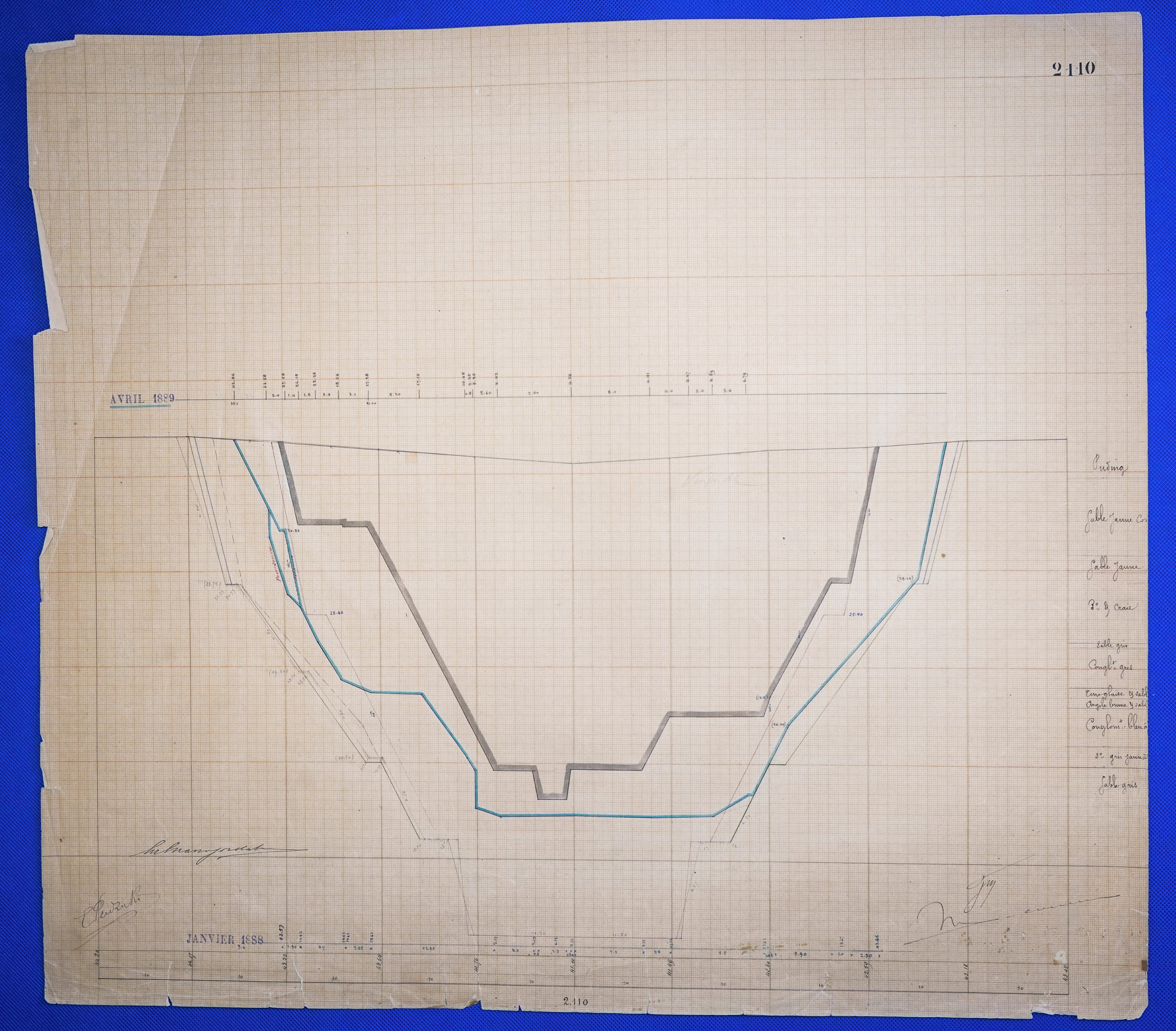- Έγχρωμο σχέδιο προόδου εκσκαφικών εργασιών (μηκοτομή) χιλ. σημείου 2110 με μελάνι και έγχρωμο μολύβι σε χαρτί μιλιμετρέ.