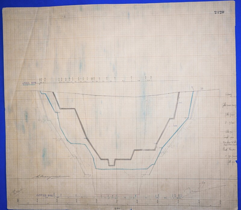 - Έγχρωμο σχέδιο προόδου εκσκαφικών εργασιών (μηκοτομή) χιλ. σημείου 2120 με μελάνι και έγχρωμο μολύβι σε χαρτί μιλιμετρέ.