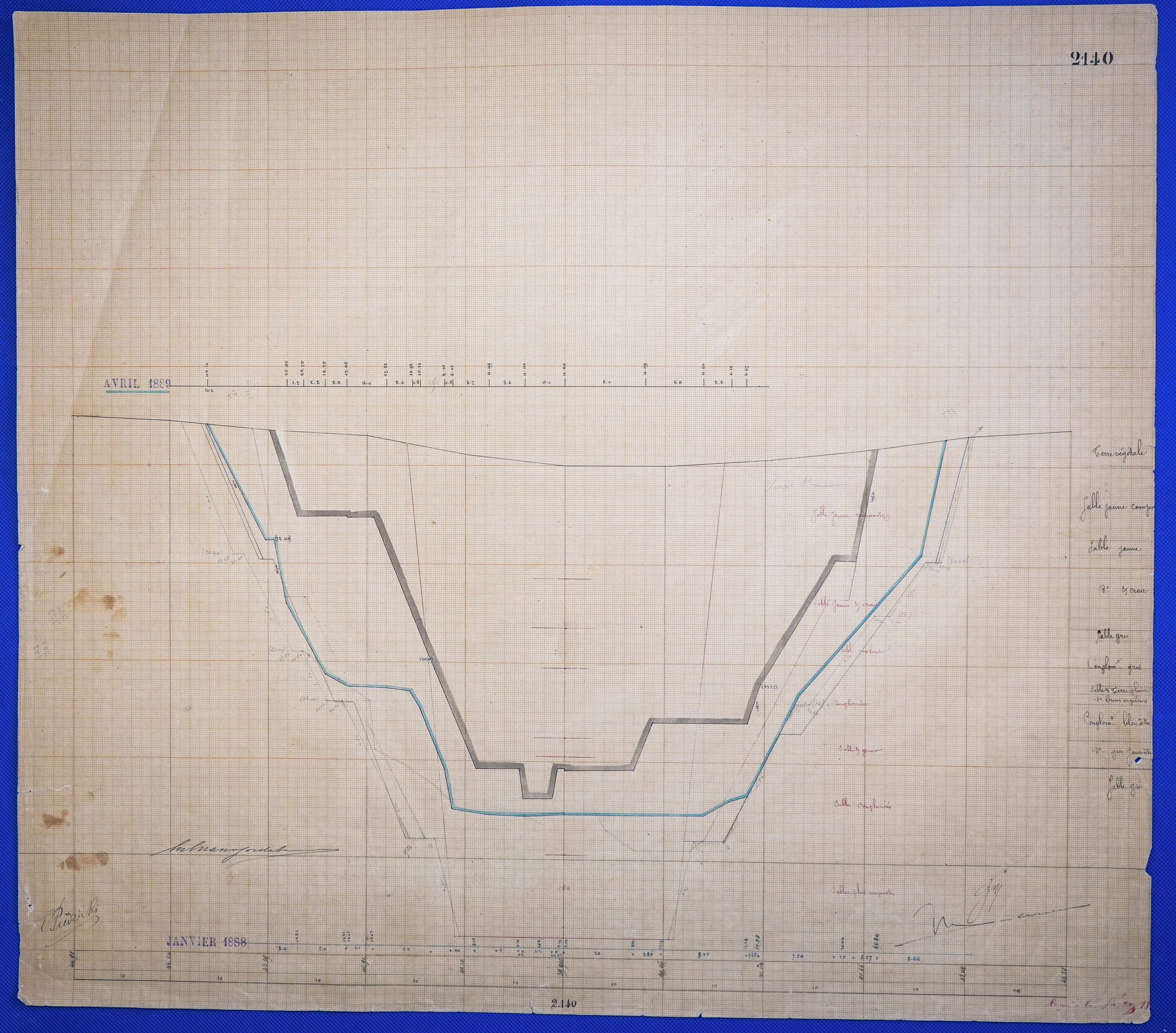 - Έγχρωμο σχέδιο προόδου εκσκαφικών εργασιών (μηκοτομή) χιλ. σημείου 2140 με μελάνι και έγχρωμο μολύβι σε χαρτί μιλιμετρέ.