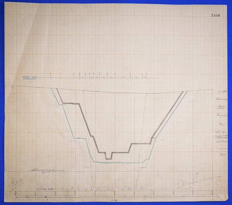 - Έγχρωμο σχέδιο προόδου εκσκαφικών εργασιών (μηκοτομή) χιλ. σημείου 2180 με μελάνι και έγχρωμο μολύβι σε χαρτί μιλιμετρέ.
