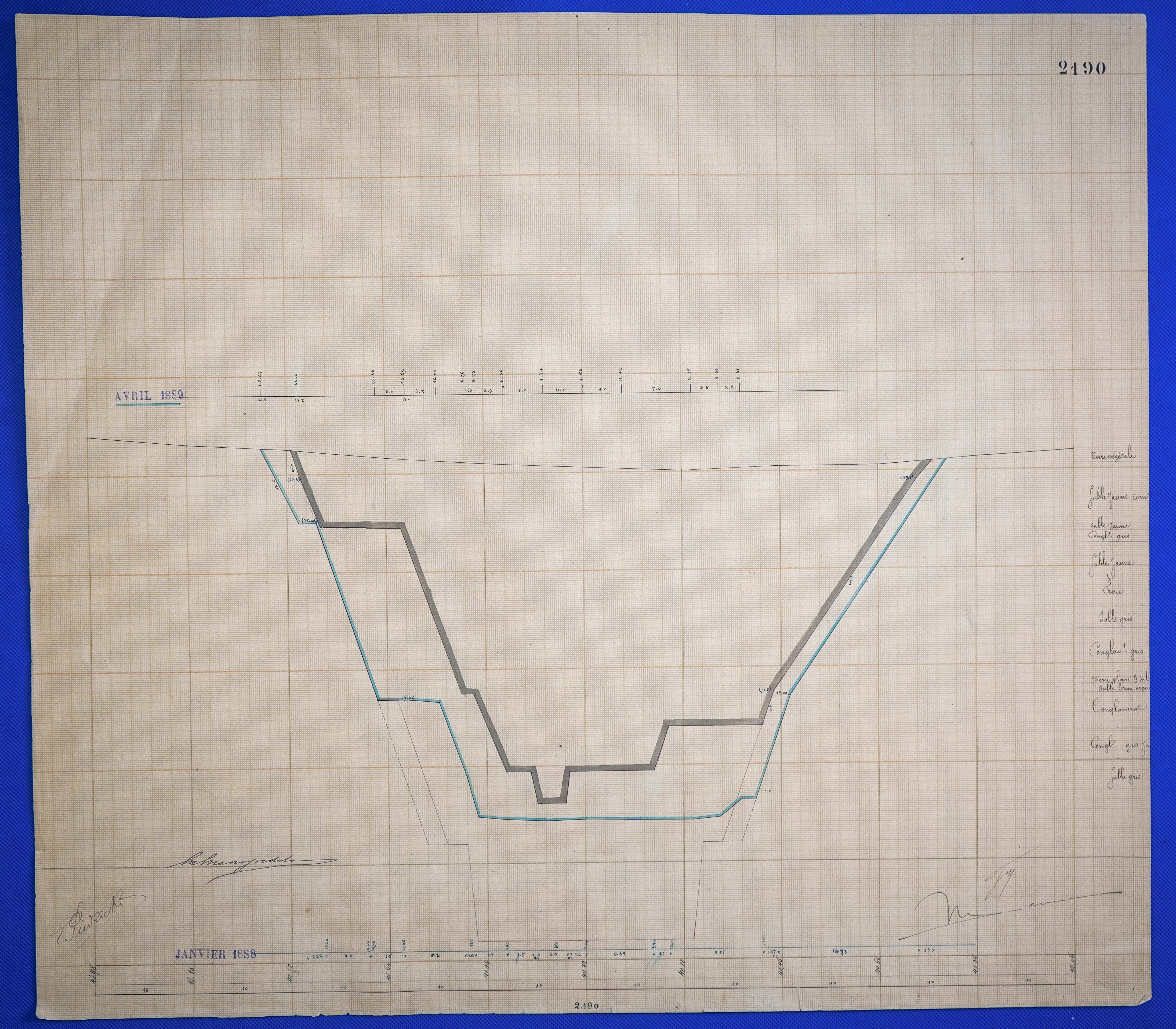 - Έγχρωμο σχέδιο προόδου εκσκαφικών εργασιών (μηκοτομή) χιλ. σημείου 2190 με μελάνι και έγχρωμο μολύβι σε χαρτί μιλιμετρέ.