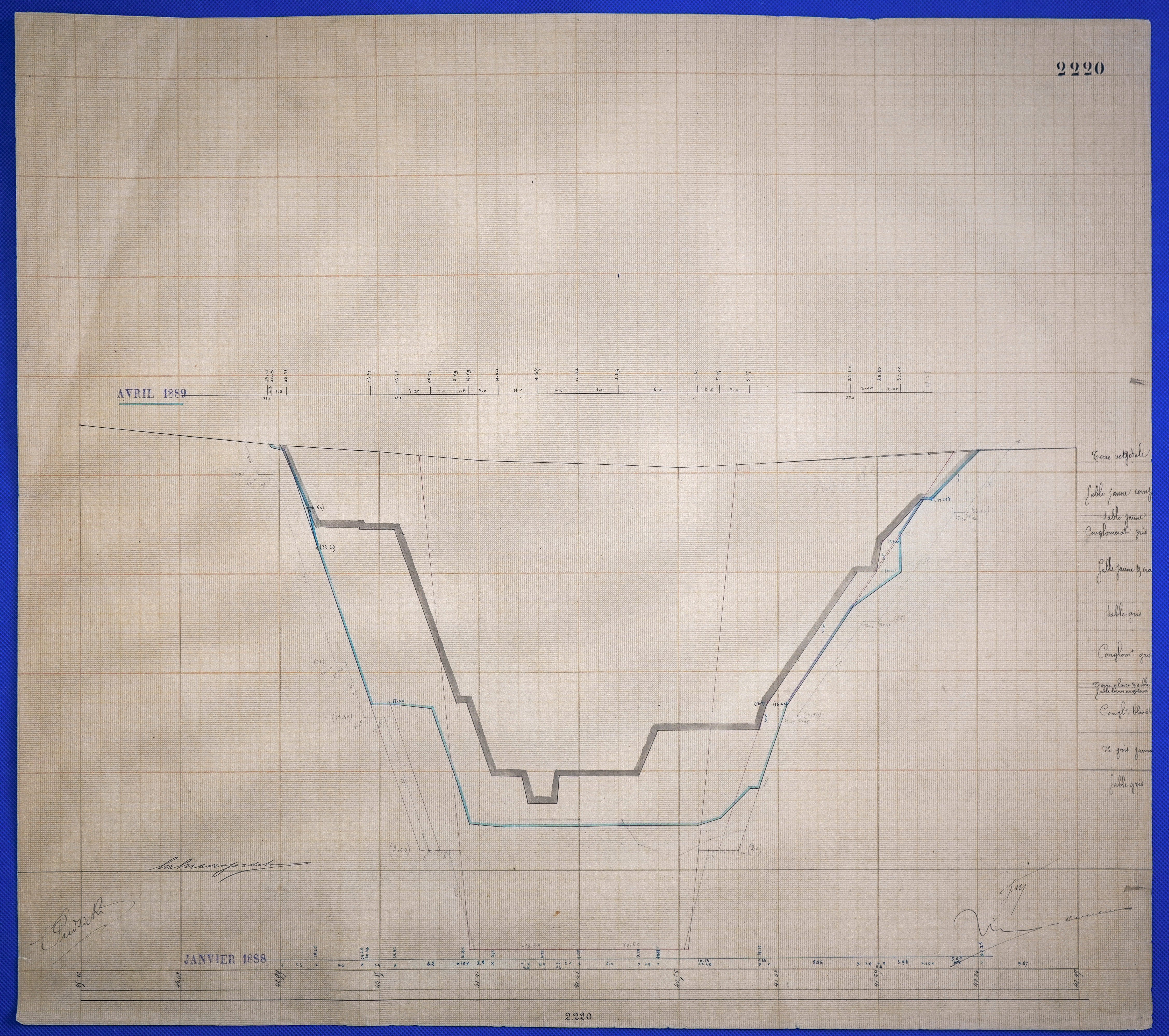 - Έγχρωμο σχέδιο προόδου εκσκαφικών εργασιών (μηκοτομή) χιλ. σημείου 2220 με μελάνι και έγχρωμο μολύβι σε χαρτί μιλιμετρέ.