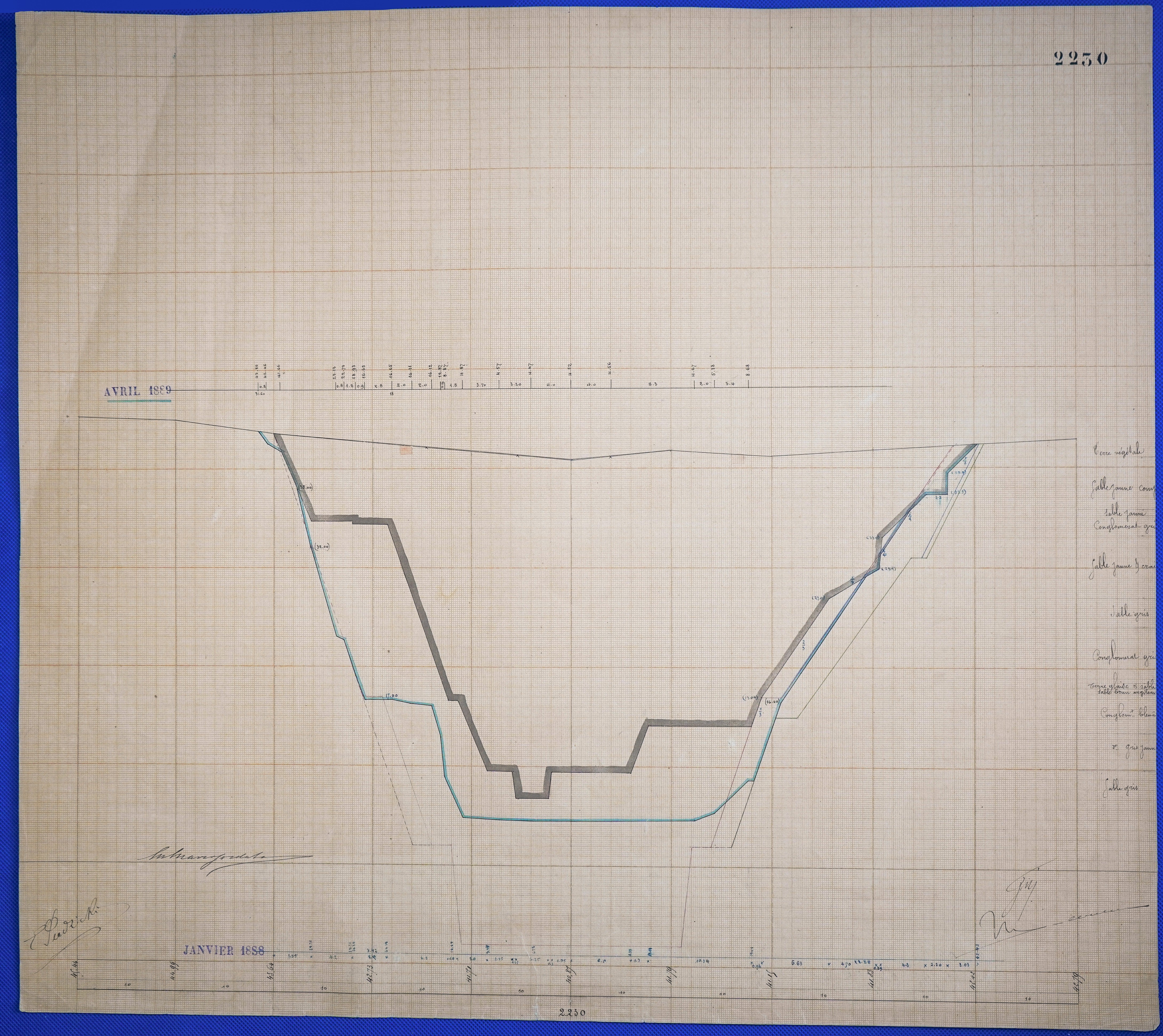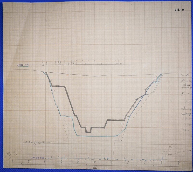 - Έγχρωμο σχέδιο προόδου εκσκαφικών εργασιών (μηκοτομή) χιλ. σημείου 2230 με μελάνι και έγχρωμο μολύβι σε χαρτί μιλιμετρέ.