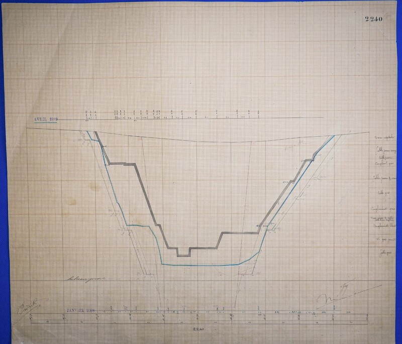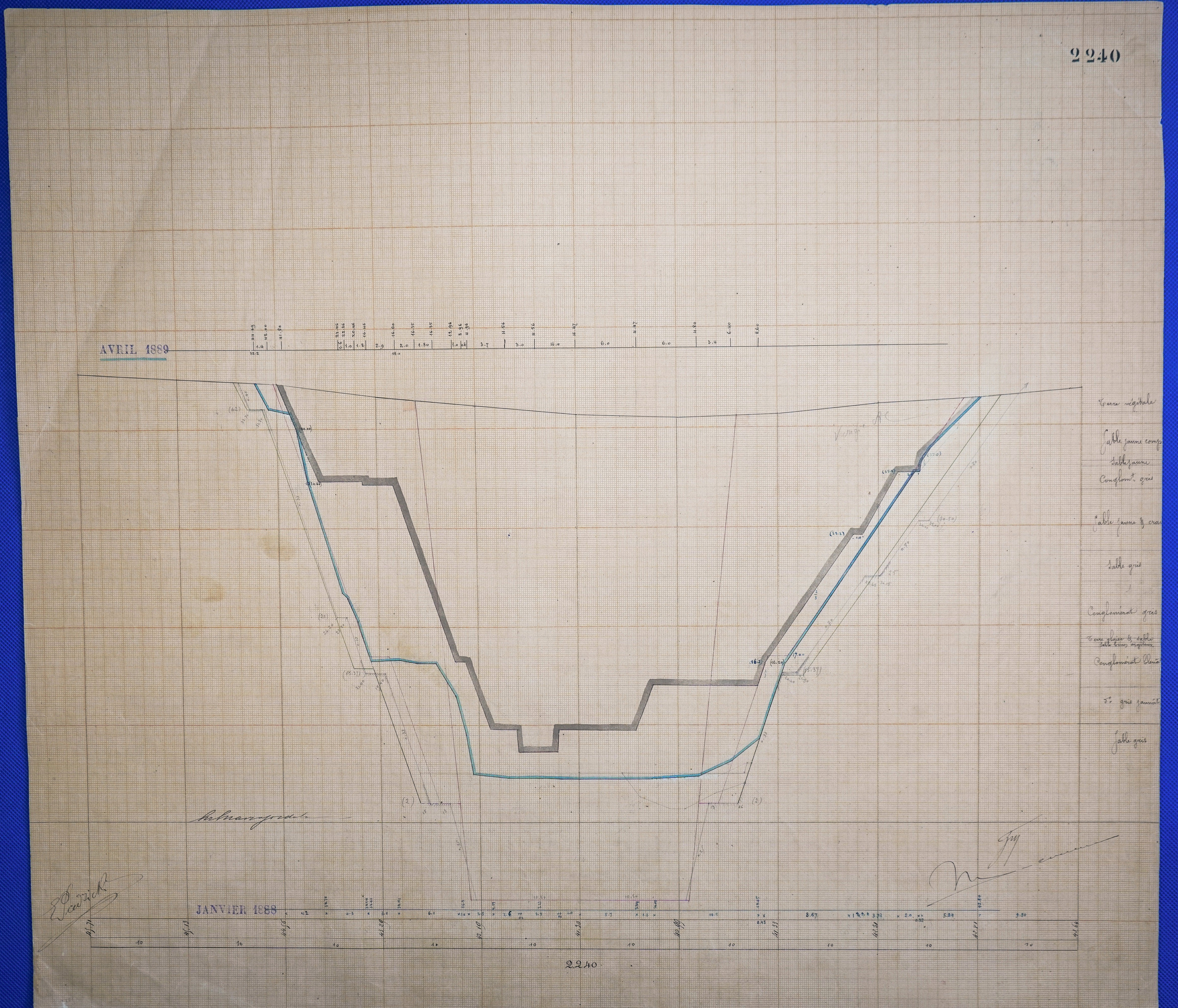 - Έγχρωμο σχέδιο προόδου εκσκαφικών εργασιών (μηκοτομή) χιλ. σημείου 2240 με μελάνι και έγχρωμο μολύβι σε χαρτί μιλιμετρέ.