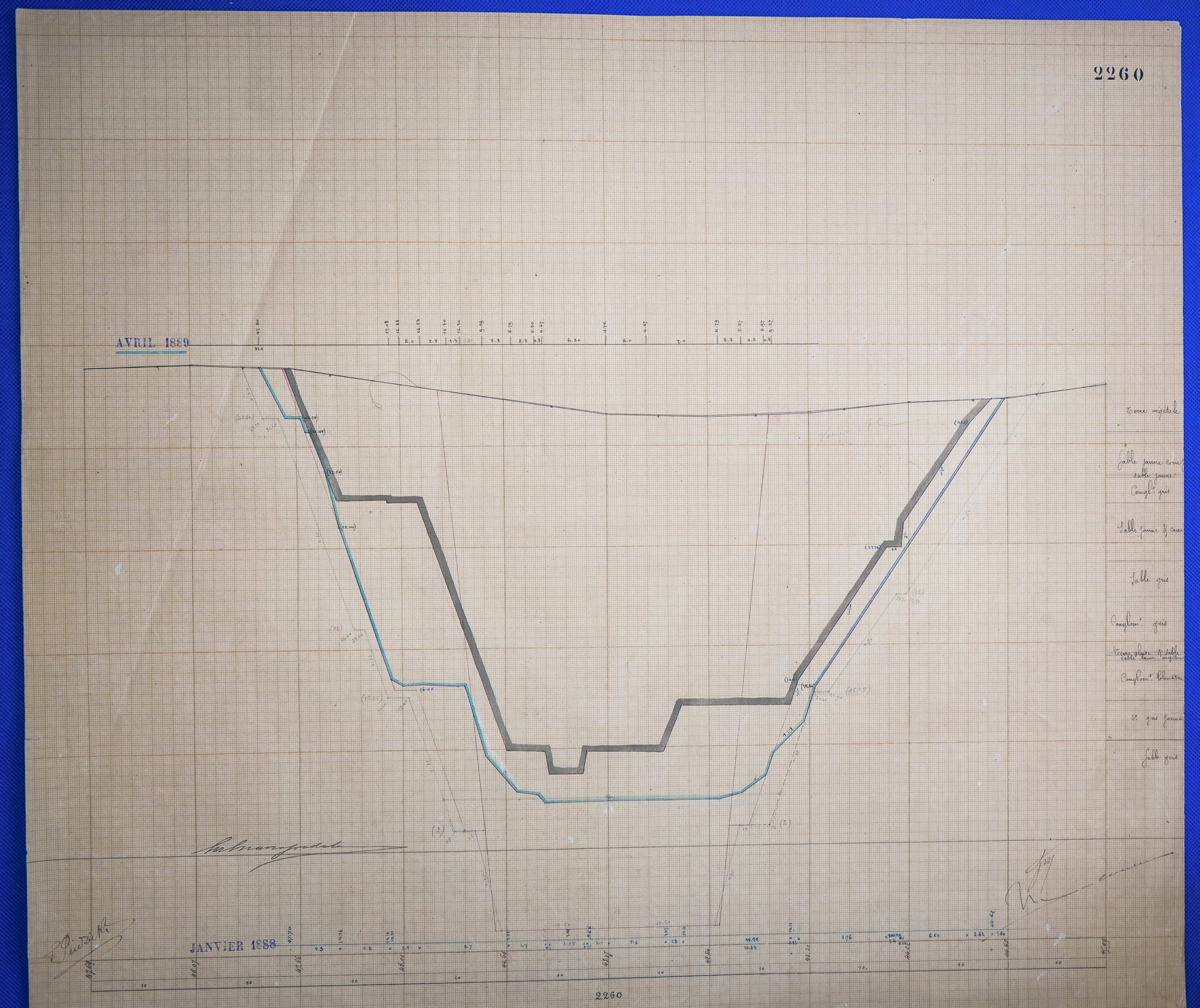 - Έγχρωμο σχέδιο προόδου εκσκαφικών εργασιών (μηκοτομή) χιλ. σημείου 2260 με μελάνι και έγχρωμο μολύβι σε χαρτί μιλιμετρέ.