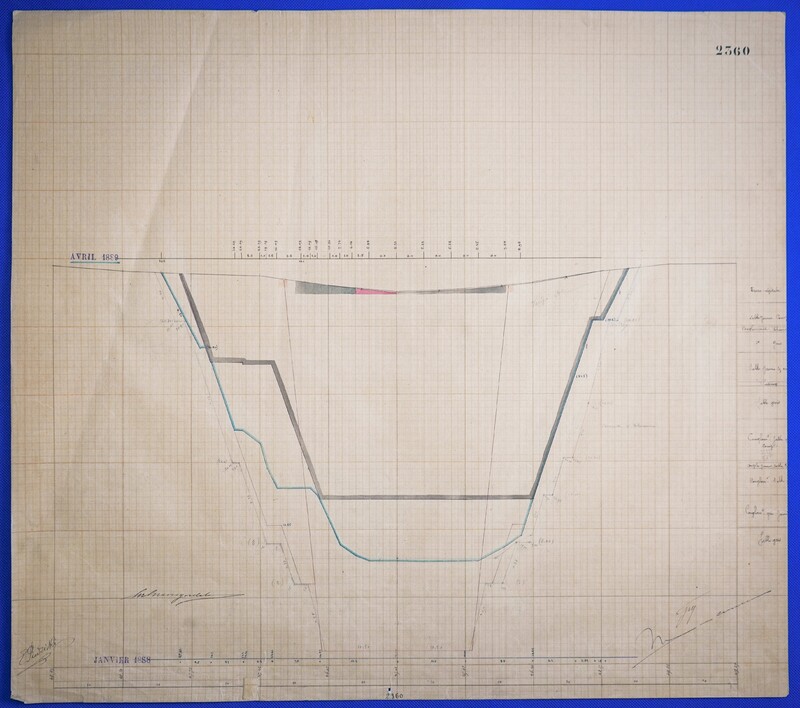 - Έγχρωμο σχέδιο προόδου εκσκαφικών εργασιών (μηκοτομή) χιλ. σημείου 2360 με μελάνι και έγχρωμο μολύβι σε χαρτί μιλιμετρέ.