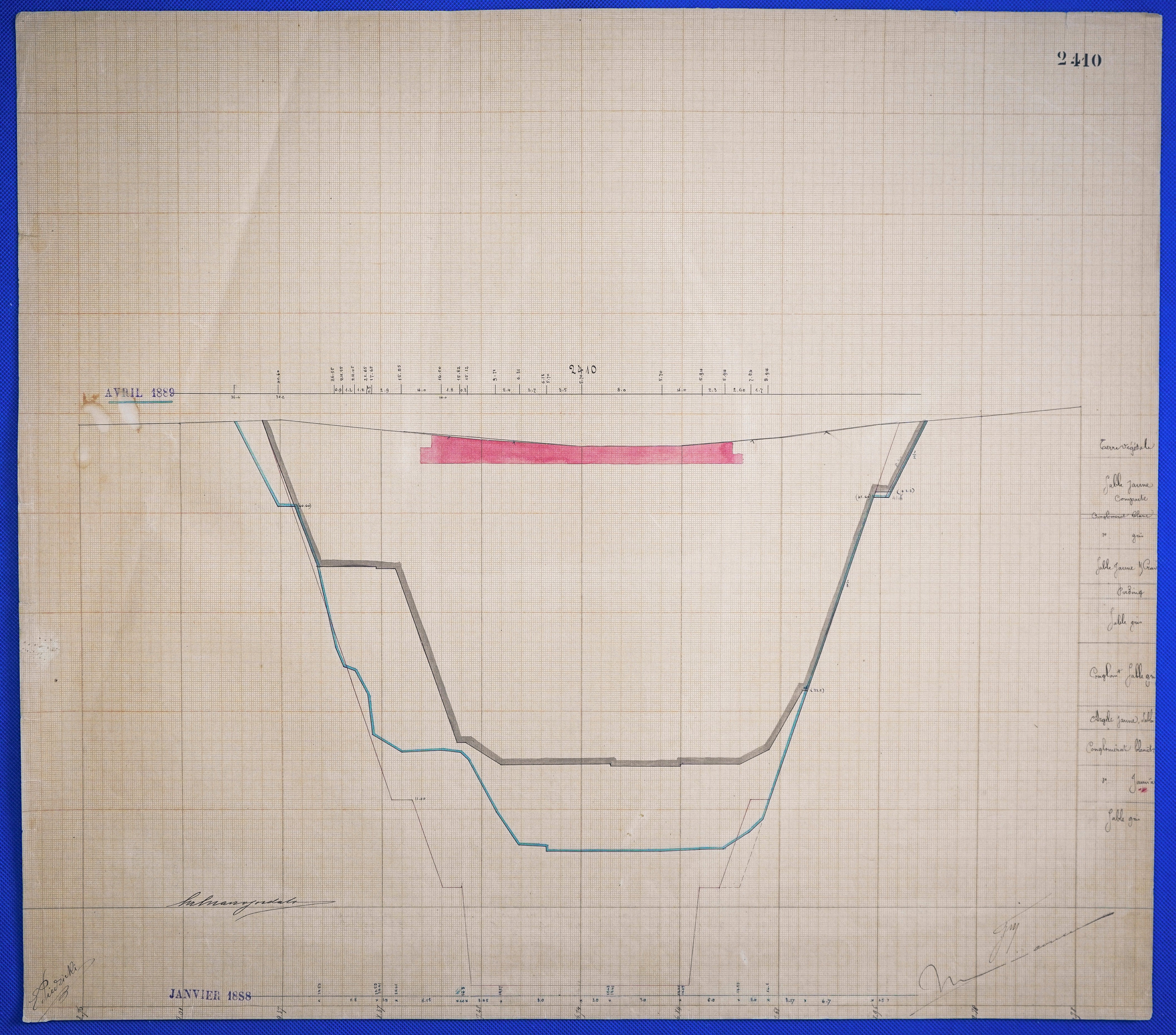 - Έγχρωμο σχέδιο προόδου εκσκαφικών εργασιών (μηκοτομή) χιλ. σημείου 2410 με μελάνι και έγχρωμο μολύβι σε χαρτί μιλιμετρέ.