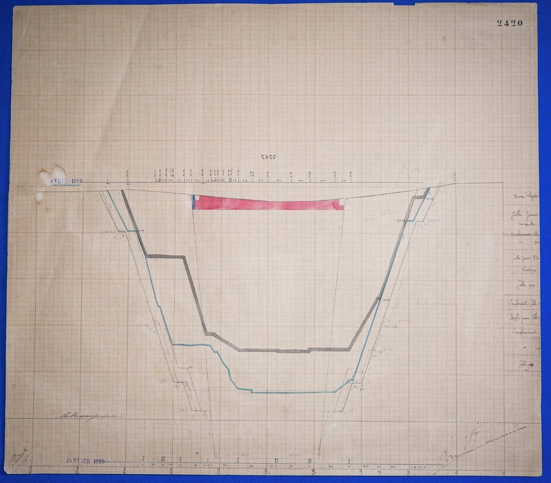 - Έγχρωμο σχέδιο προόδου εκσκαφικών εργασιών (μηκοτομή) χιλ. σημείου 2420 με μελάνι και έγχρωμο μολύβι σε χαρτί μιλιμετρέ.