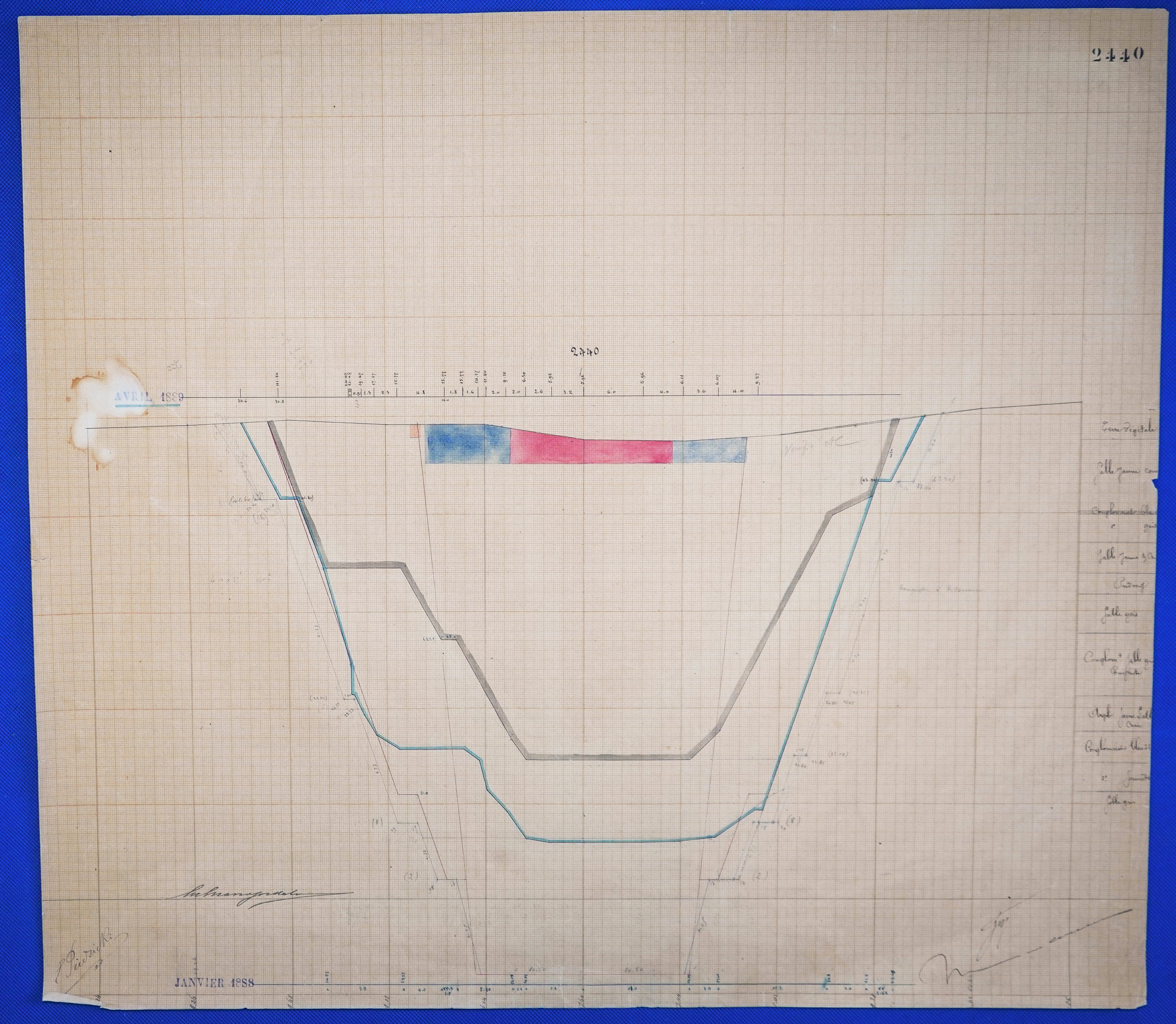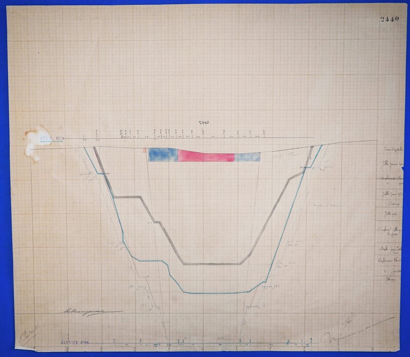 - Έγχρωμο σχέδιο προόδου εκσκαφικών εργασιών (μηκοτομή) χιλ. σημείου 2440 με μελάνι και έγχρωμο μολύβι σε χαρτί μιλιμετρέ.