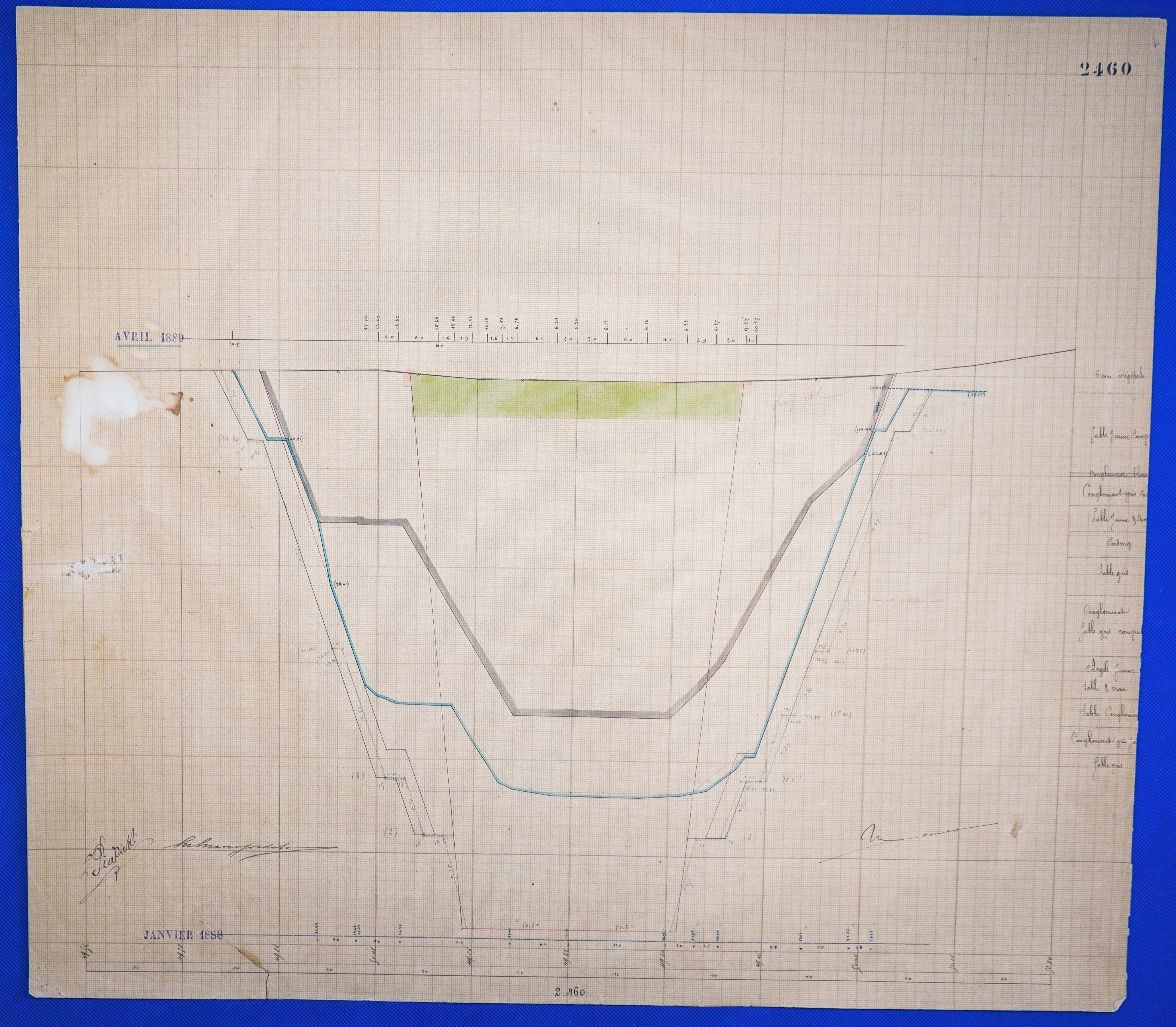 - Έγχρωμο σχέδιο προόδου εκσκαφικών εργασιών (μηκοτομή) χιλ. σημείου 2460 με μελάνι και έγχρωμο μολύβι σε χαρτί μιλιμετρέ.