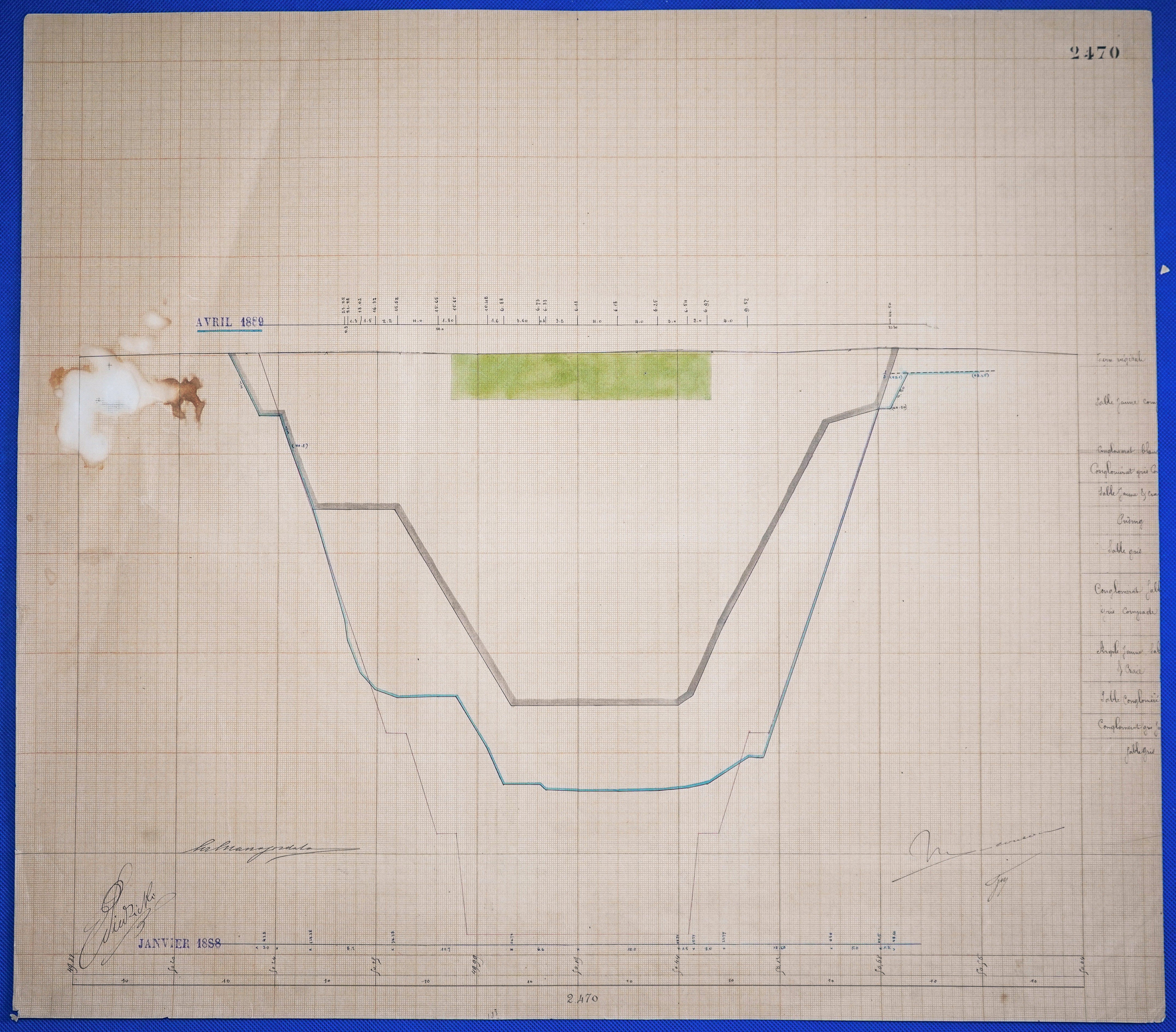 - Έγχρωμο σχέδιο προόδου εκσκαφικών εργασιών (μηκοτομή) χιλ. σημείου 2470 με μελάνι και έγχρωμο μολύβι σε χαρτί μιλιμετρέ.