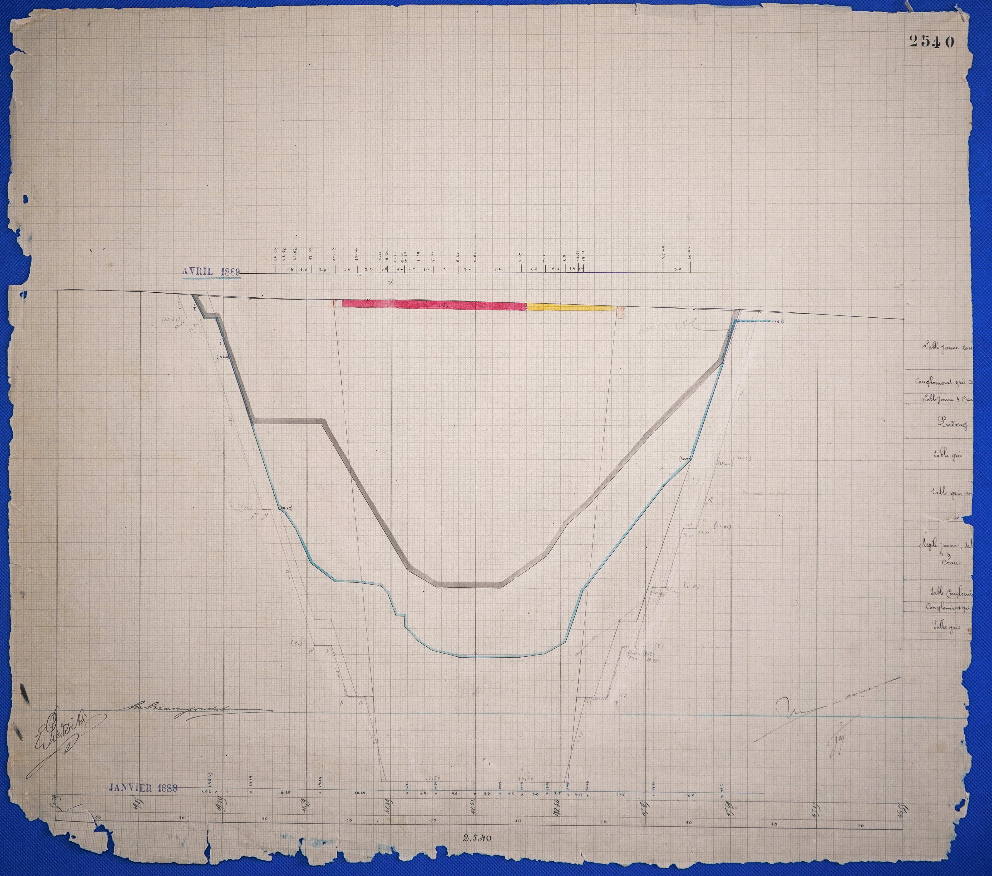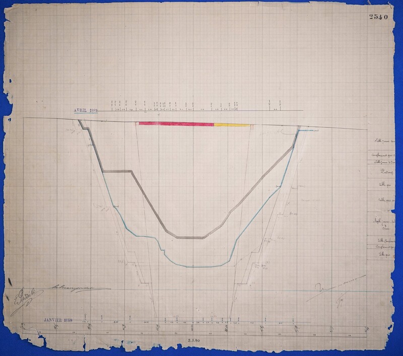 - Έγχρωμο σχέδιο προόδου εκσκαφικών εργασιών (μηκοτομή) χιλ. σημείου 2540 με μελάνι και έγχρωμο μολύβι σε χαρτί μιλιμετρέ.