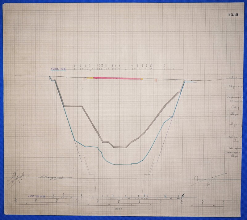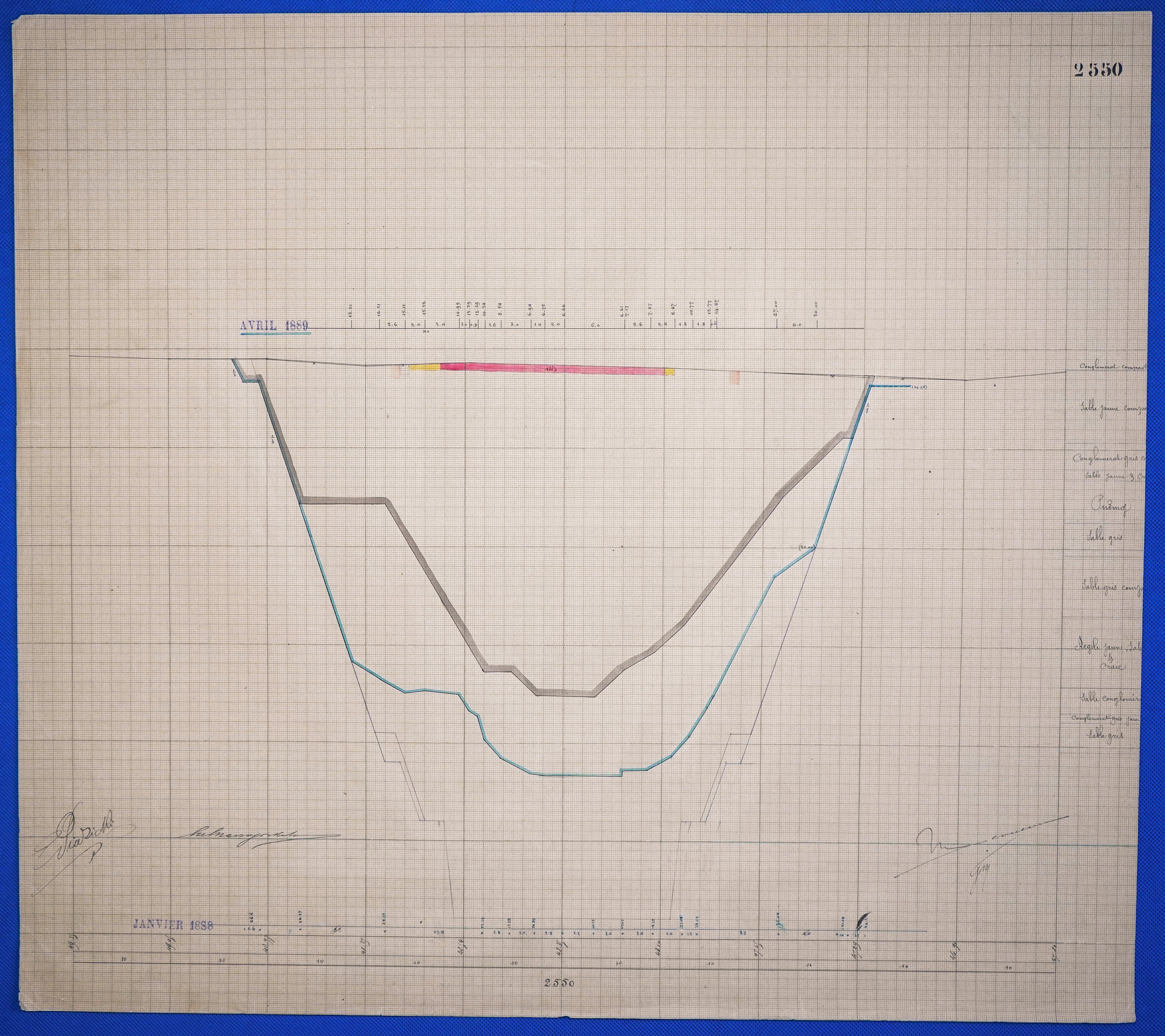 - Έγχρωμο σχέδιο προόδου εκσκαφικών εργασιών (μηκοτομή) χιλ. σημείου 2550 με μελάνι και έγχρωμο μολύβι σε χαρτί μιλιμετρέ.