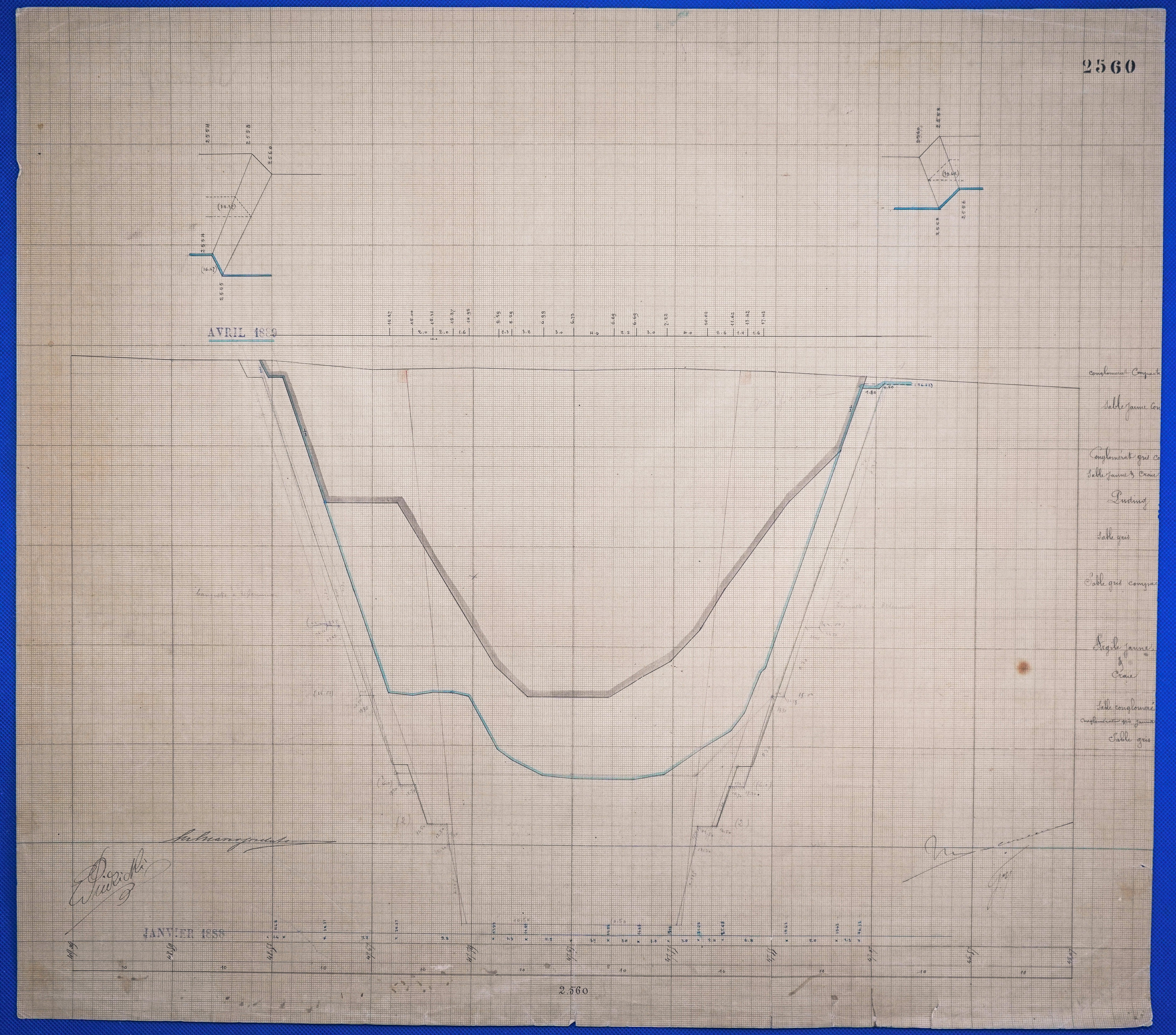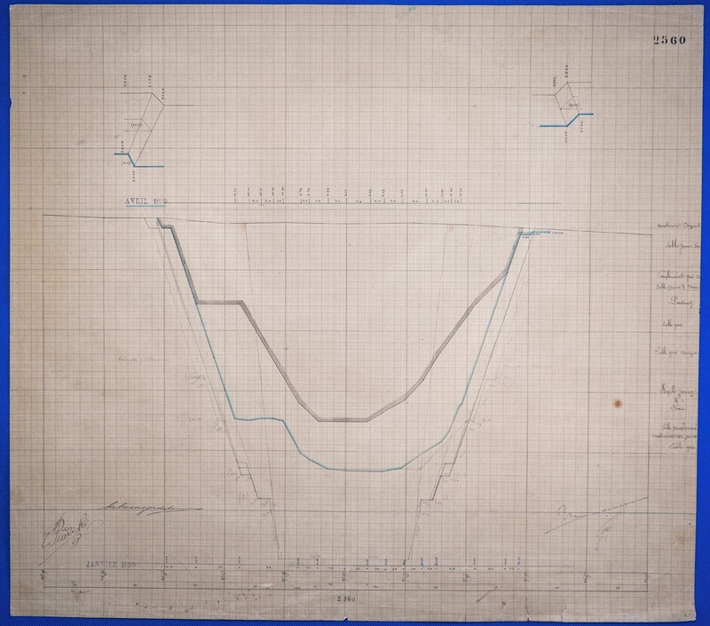 - Έγχρωμο σχέδιο προόδου εκσκαφικών εργασιών (μηκοτομή) χιλ. σημείου 2560 με μελάνι και έγχρωμο μολύβι σε χαρτί μιλιμετρέ.