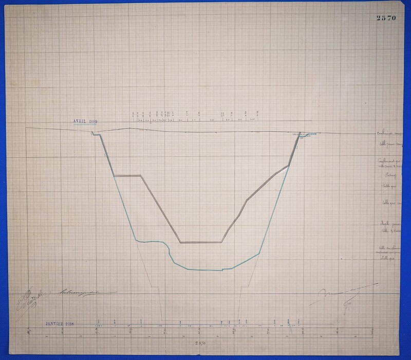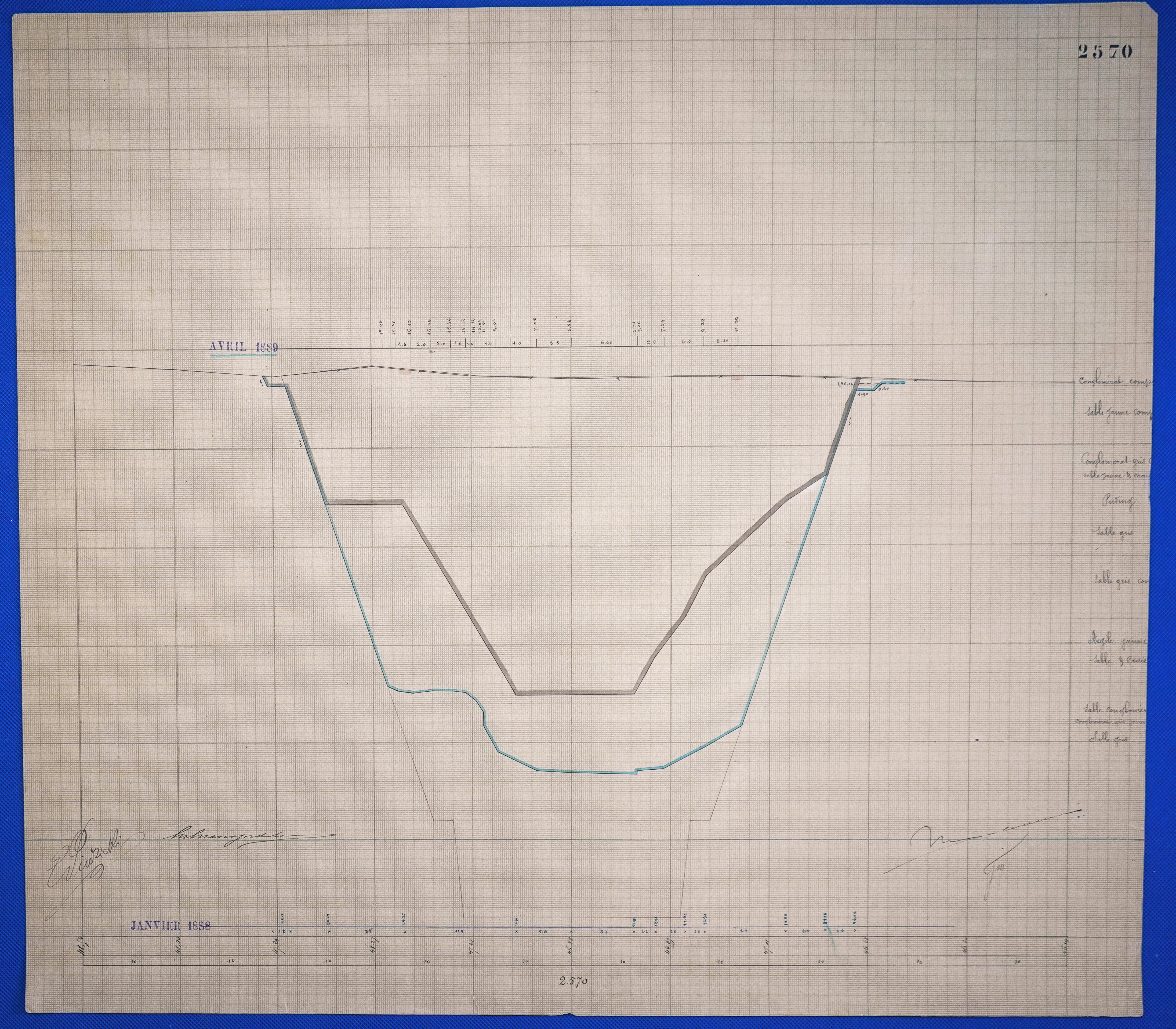 - Έγχρωμο σχέδιο προόδου εκσκαφικών εργασιών (μηκοτομή) χιλ. σημείου 2570 με μελάνι και έγχρωμο μολύβι σε χαρτί μιλιμετρέ.