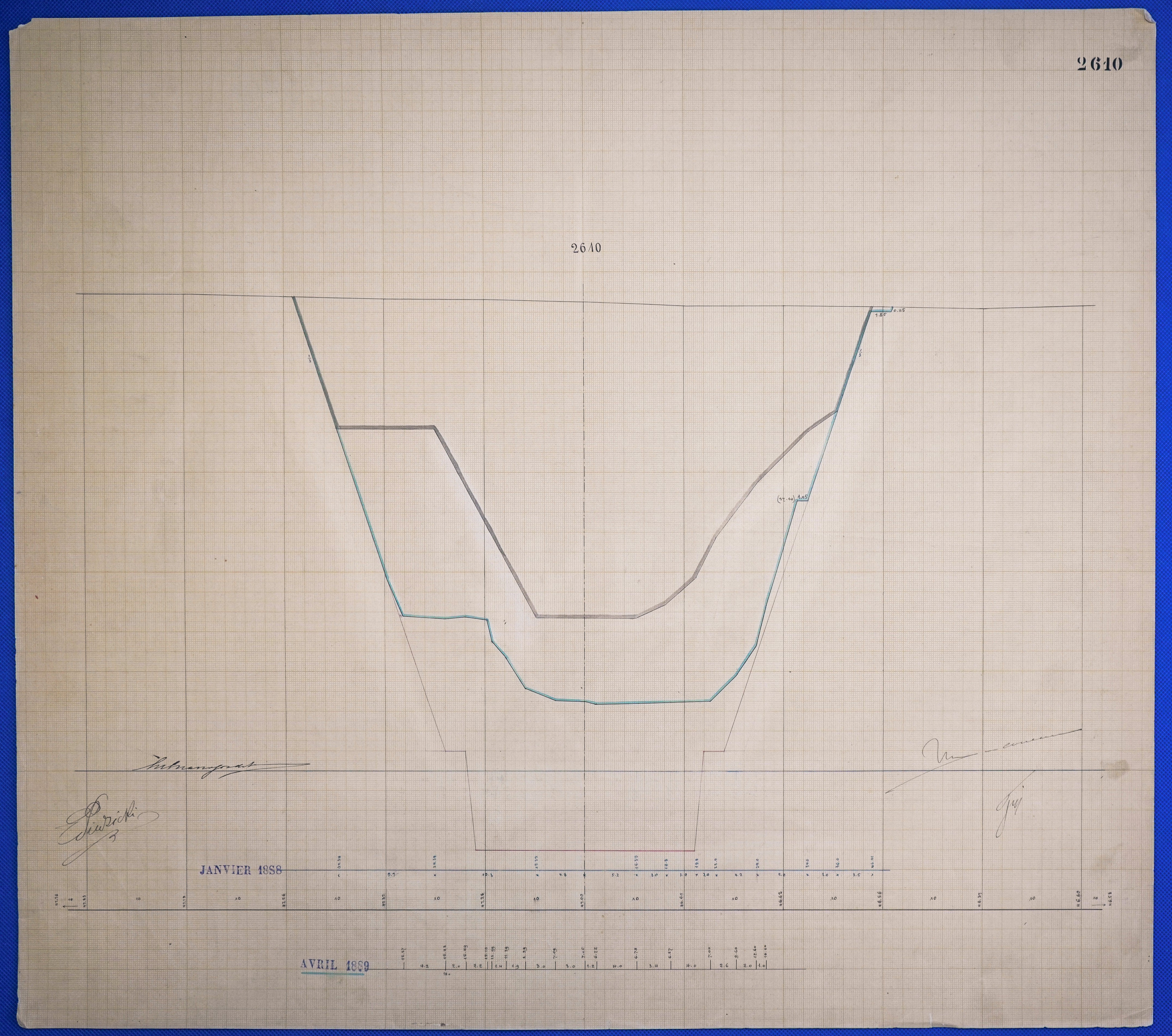 - Έγχρωμο σχέδιο προόδου εκσκαφικών εργασιών (μηκοτομή) χιλ. σημείου 2610 με μελάνι και έγχρωμο μολύβι σε χαρτί μιλιμετρέ.
