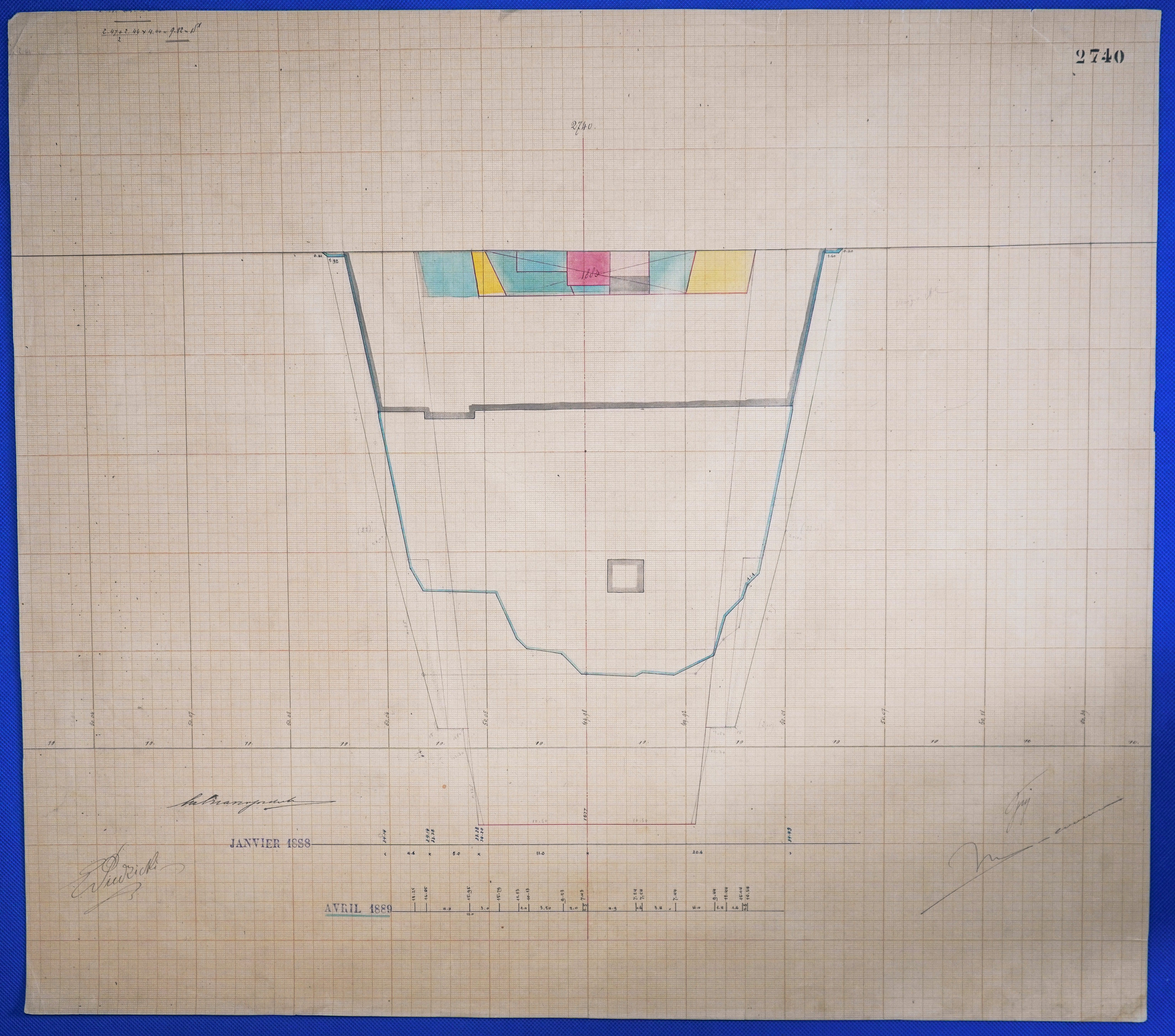 - Έγχρωμο σχέδιο προόδου εκσκαφικών εργασιών (μηκοτομή) χιλ. σημείου 2740 με μελάνι και έγχρωμο μολύβι σε χαρτί μιλιμετρέ.