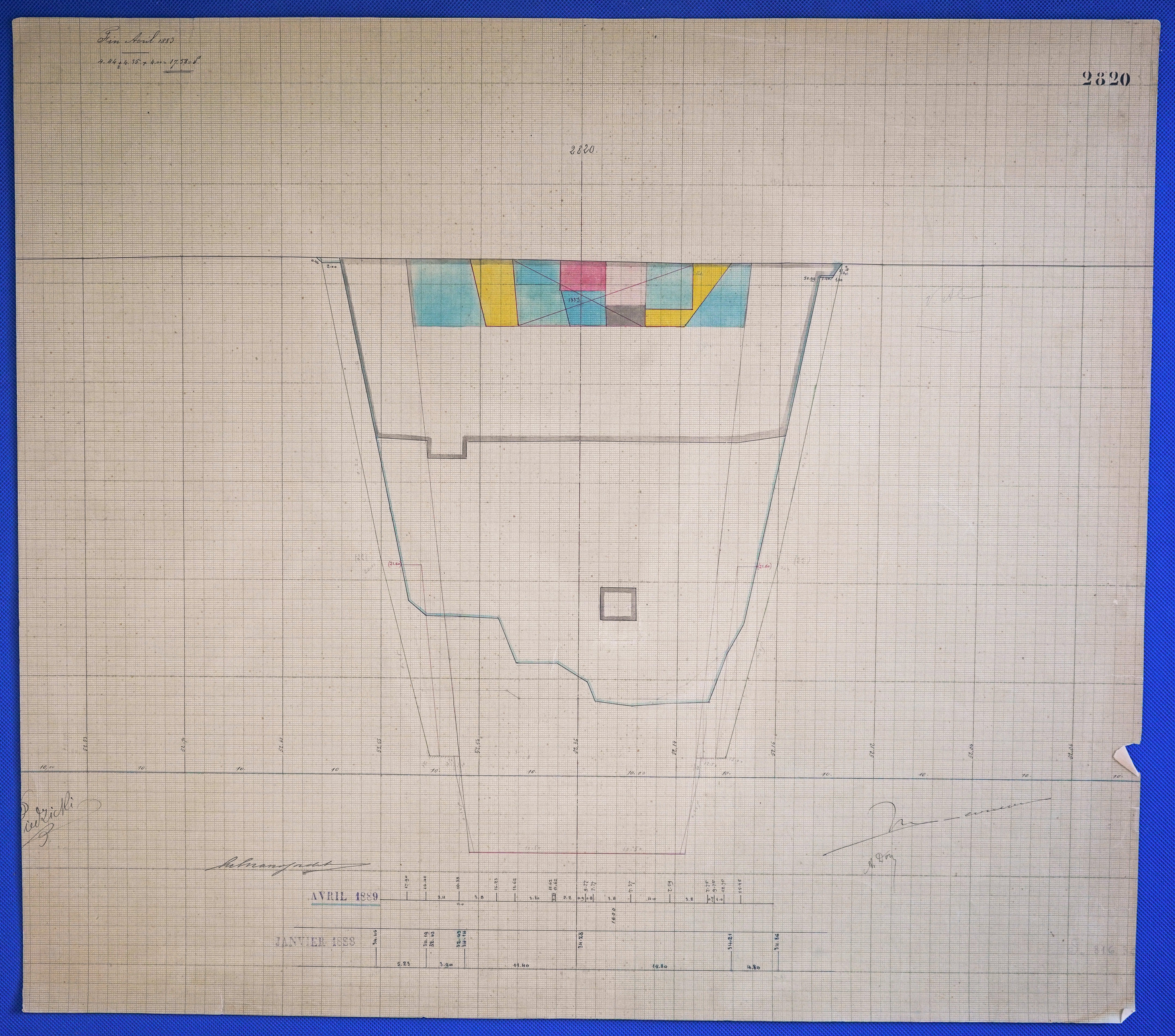 - Έγχρωμο σχέδιο προόδου εκσκαφικών εργασιών (μηκοτομή) χιλ. σημείου 2820 με μελάνι και έγχρωμο μολύβι σε χαρτί μιλιμετρέ.