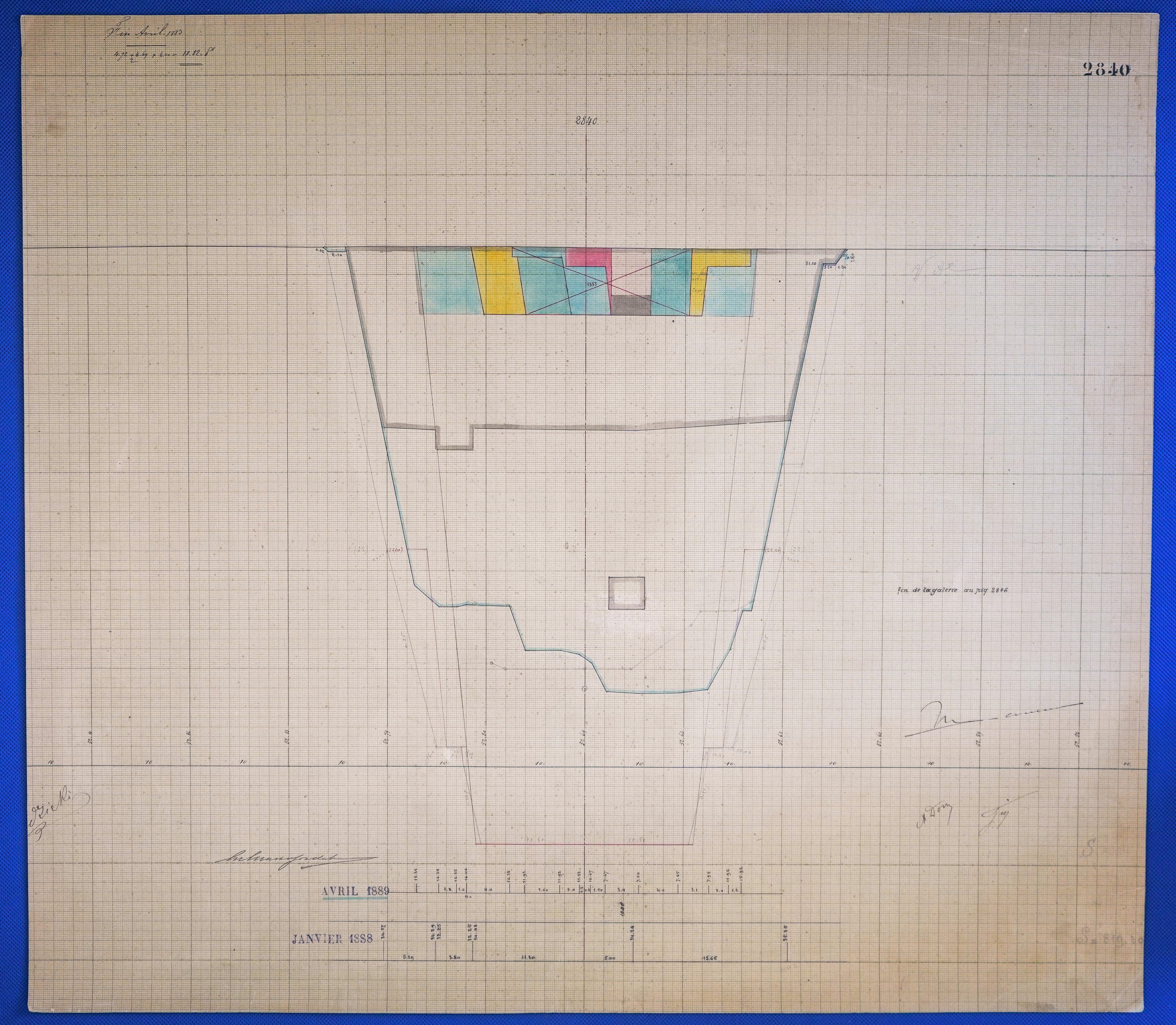 - Έγχρωμο σχέδιο προόδου εκσκαφικών εργασιών (μηκοτομή) χιλ. σημείου 2840 με μελάνι και έγχρωμο μολύβι σε χαρτί μιλιμετρέ.