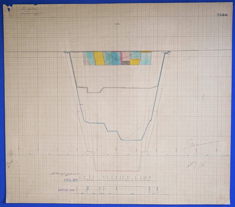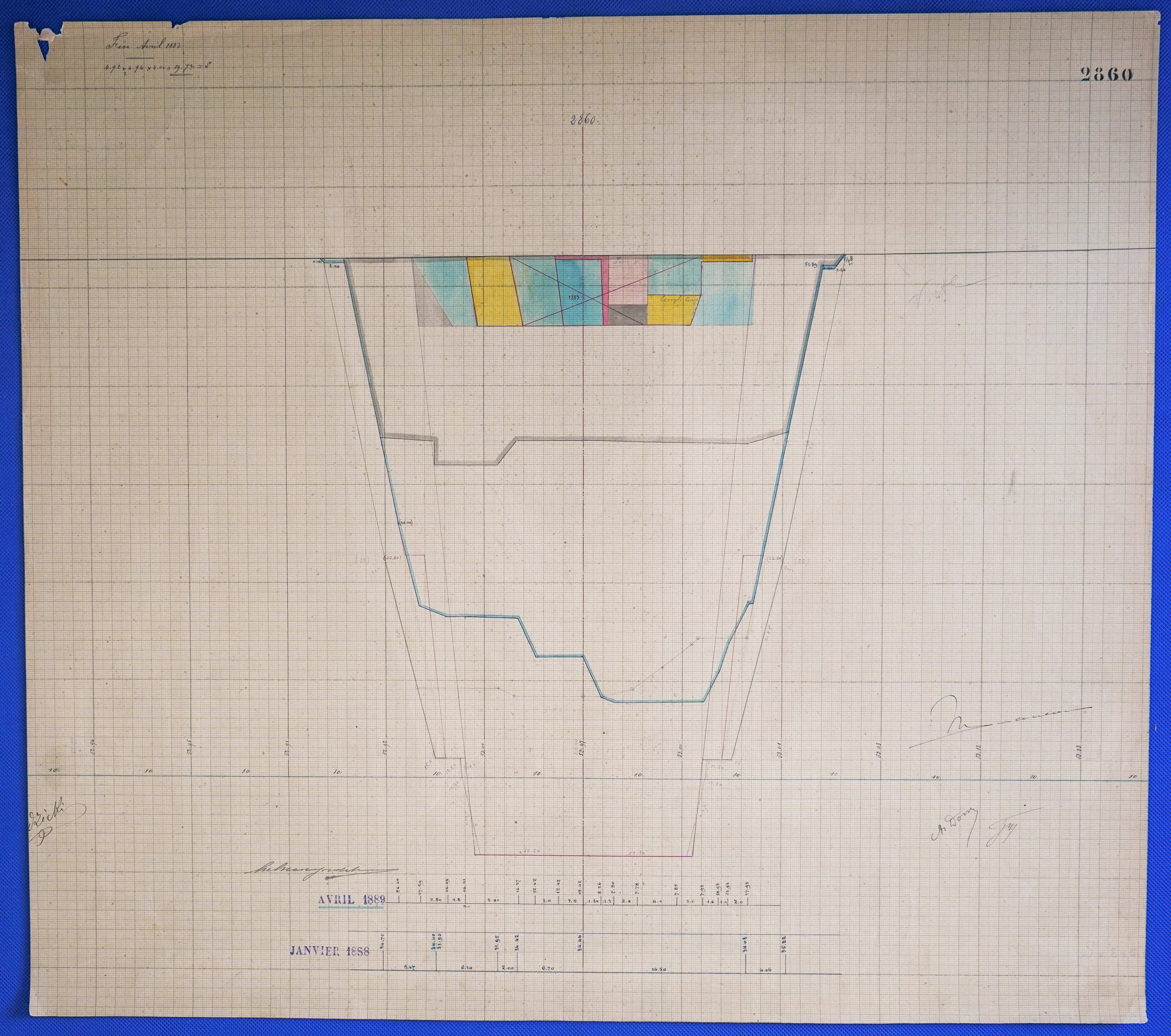- Έγχρωμο σχέδιο προόδου εκσκαφικών εργασιών (μηκοτομή) χιλ. σημείου 2860 με μελάνι και έγχρωμο μολύβι σε χαρτί μιλιμετρέ.