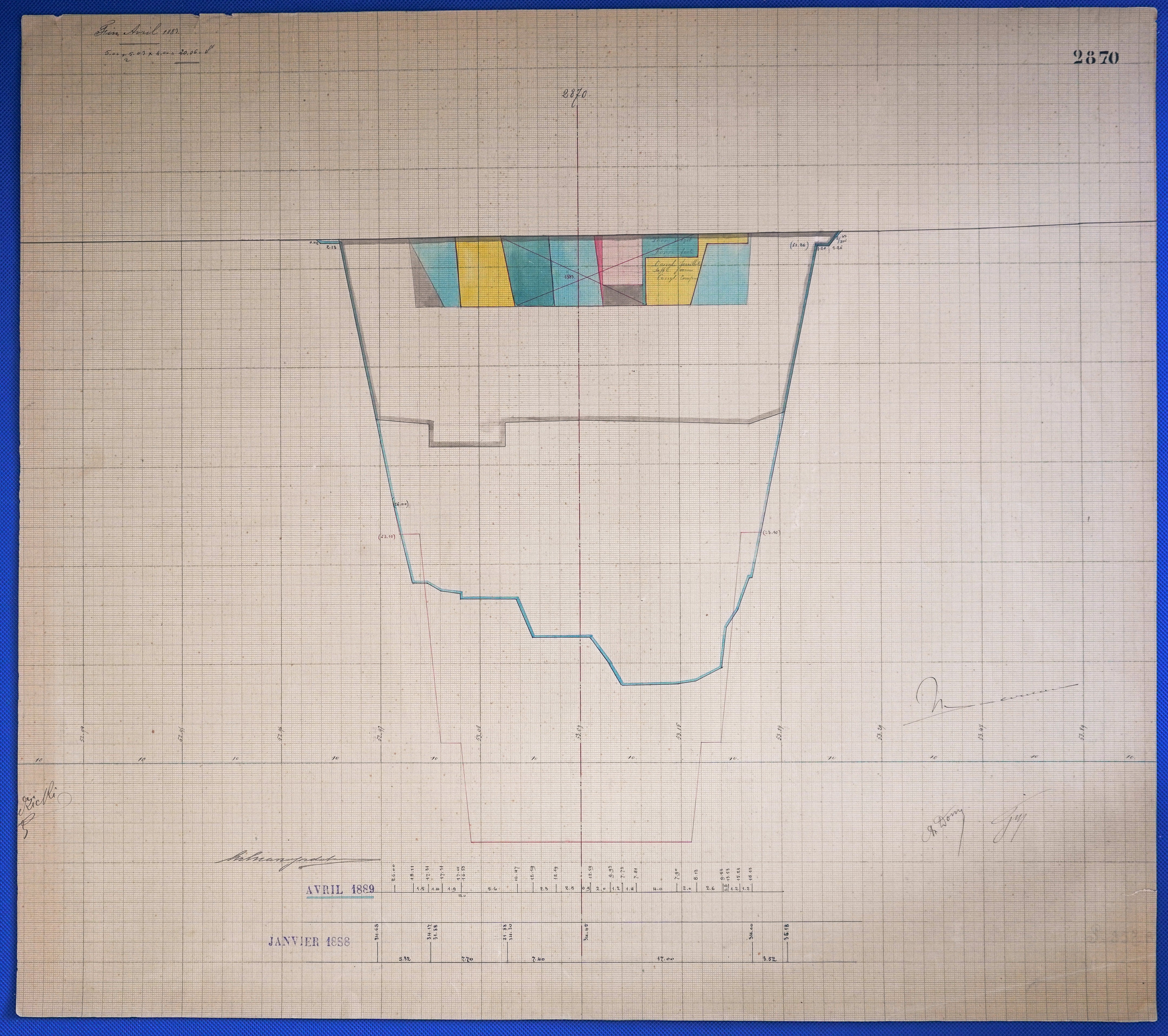 - Έγχρωμο σχέδιο προόδου εκσκαφικών εργασιών (μηκοτομή) χιλ. σημείου 2870 με μελάνι και έγχρωμο μολύβι σε χαρτί μιλιμετρέ.