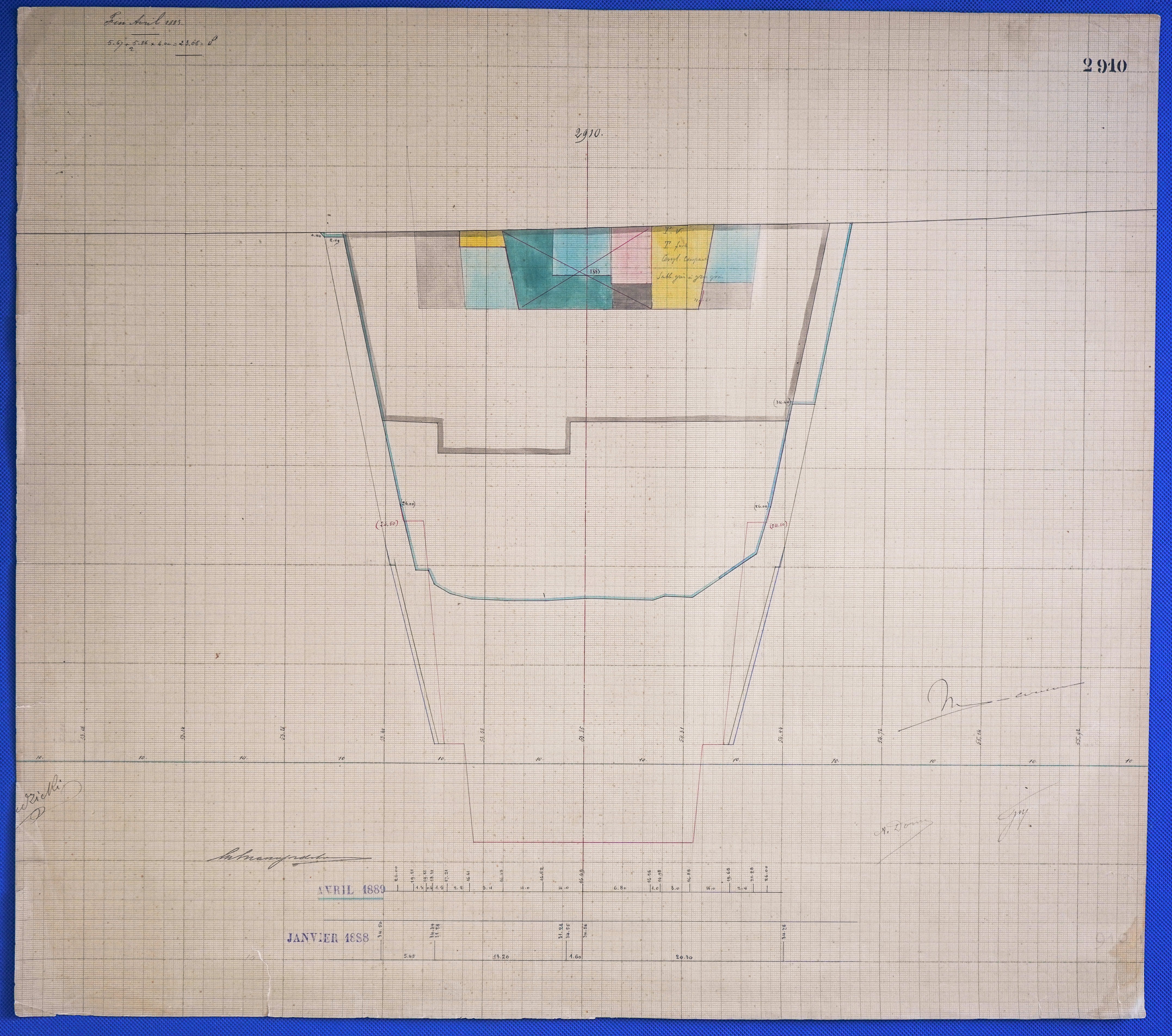 - Έγχρωμο σχέδιο προόδου εκσκαφικών εργασιών (μηκοτομή) χιλ. σημείου 2910 με μελάνι και έγχρωμο μολύβι σε χαρτί μιλιμετρέ.