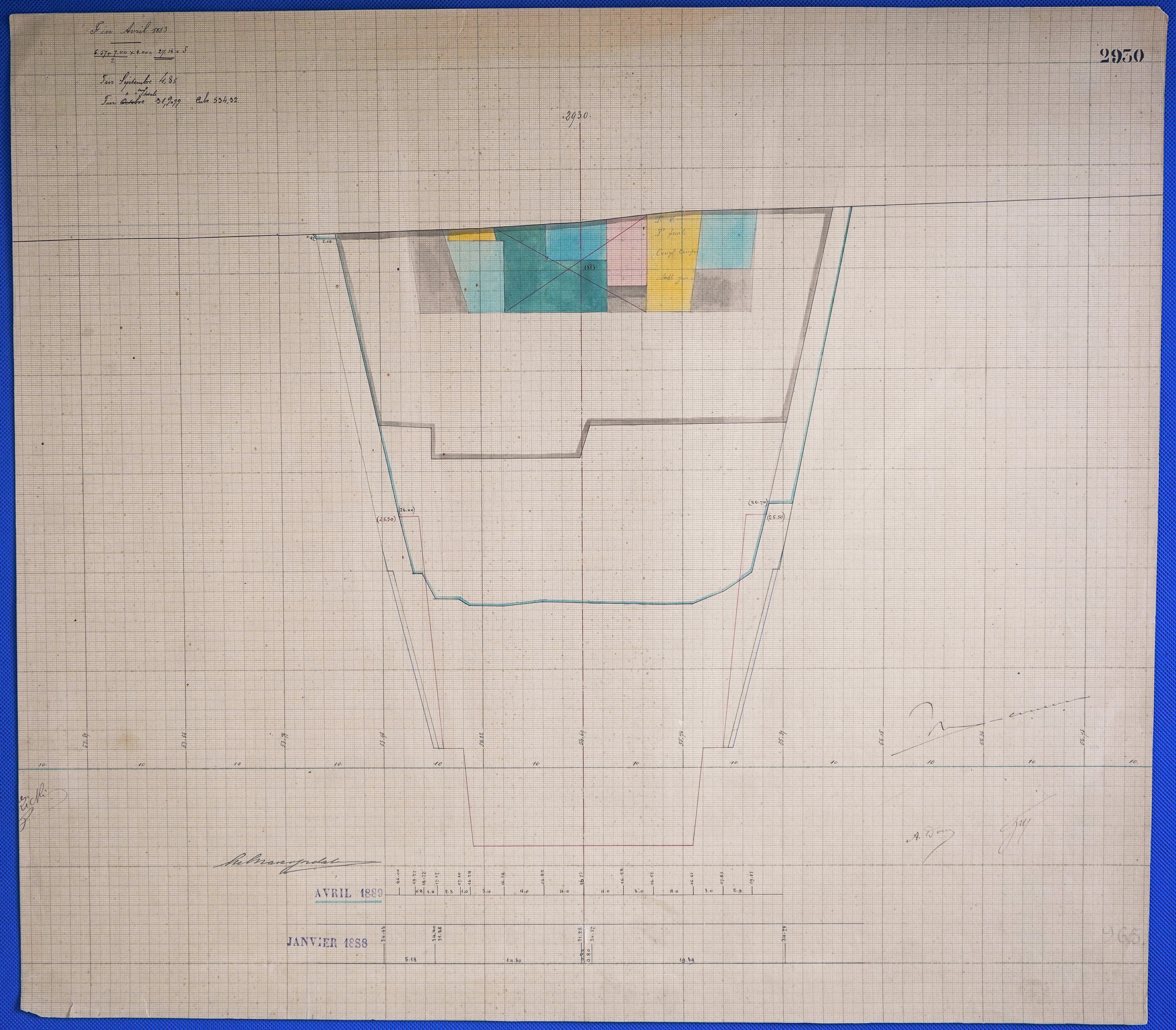 - Έγχρωμο σχέδιο προόδου εκσκαφικών εργασιών (μηκοτομή) χιλ. σημείου 2930 με μελάνι και έγχρωμο μολύβι σε χαρτί μιλιμετρέ.