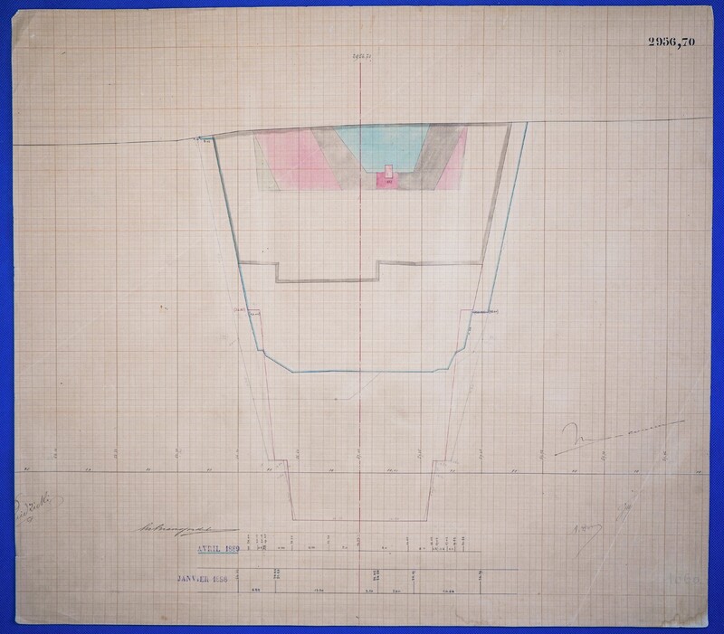 - Έγχρωμο σχέδιο προόδου εκσκαφικών εργασιών (μηκοτομή) χιλ. σημείου 2956,70 με μελάνι και έγχρωμο μολύβι σε χαρτί μιλιμετρέ.