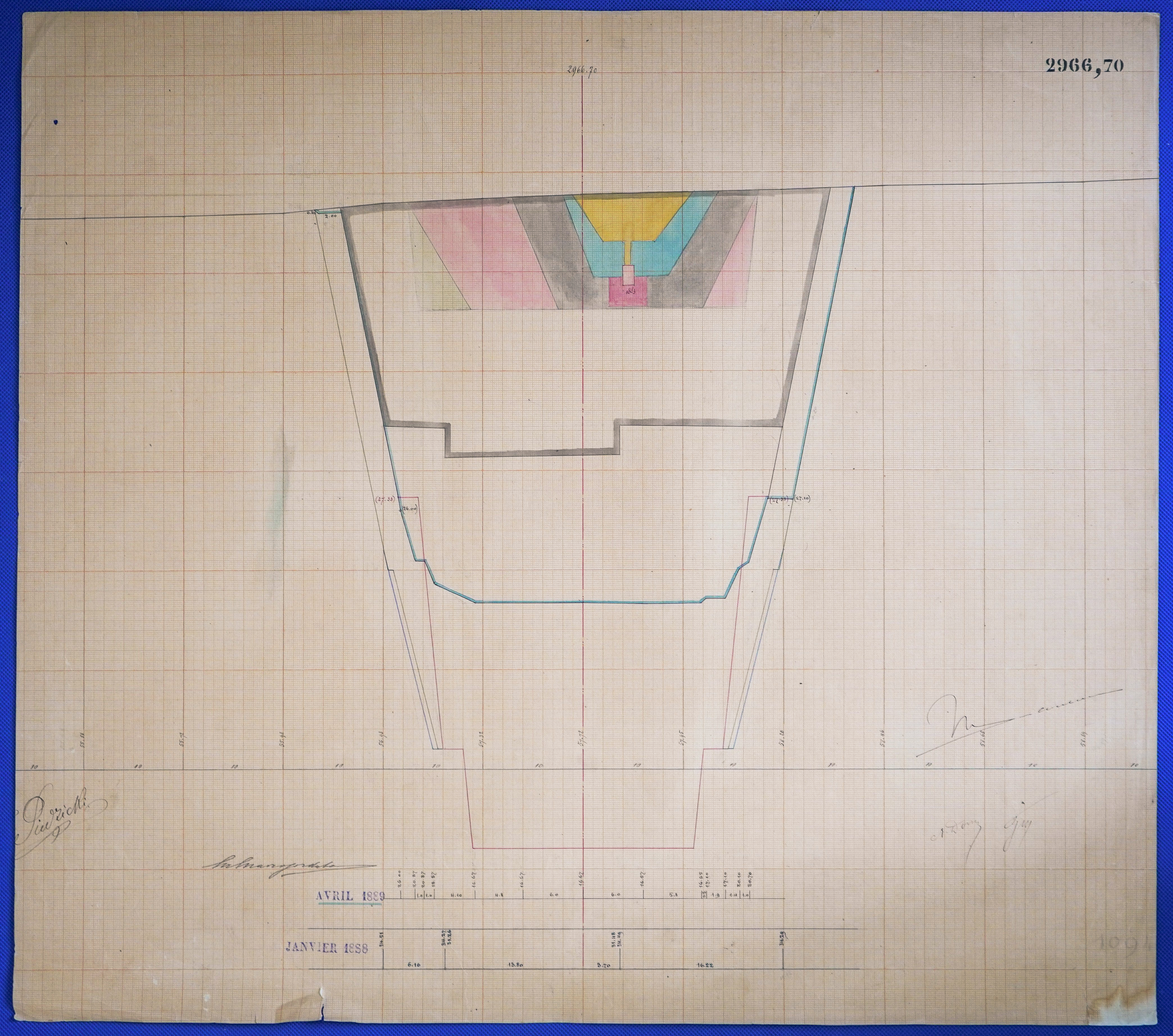 - Έγχρωμο σχέδιο προόδου εκσκαφικών εργασιών (μηκοτομή) χιλ. σημείου 2966,70 με μελάνι και έγχρωμο μολύβι σε χαρτί μιλιμετρέ.