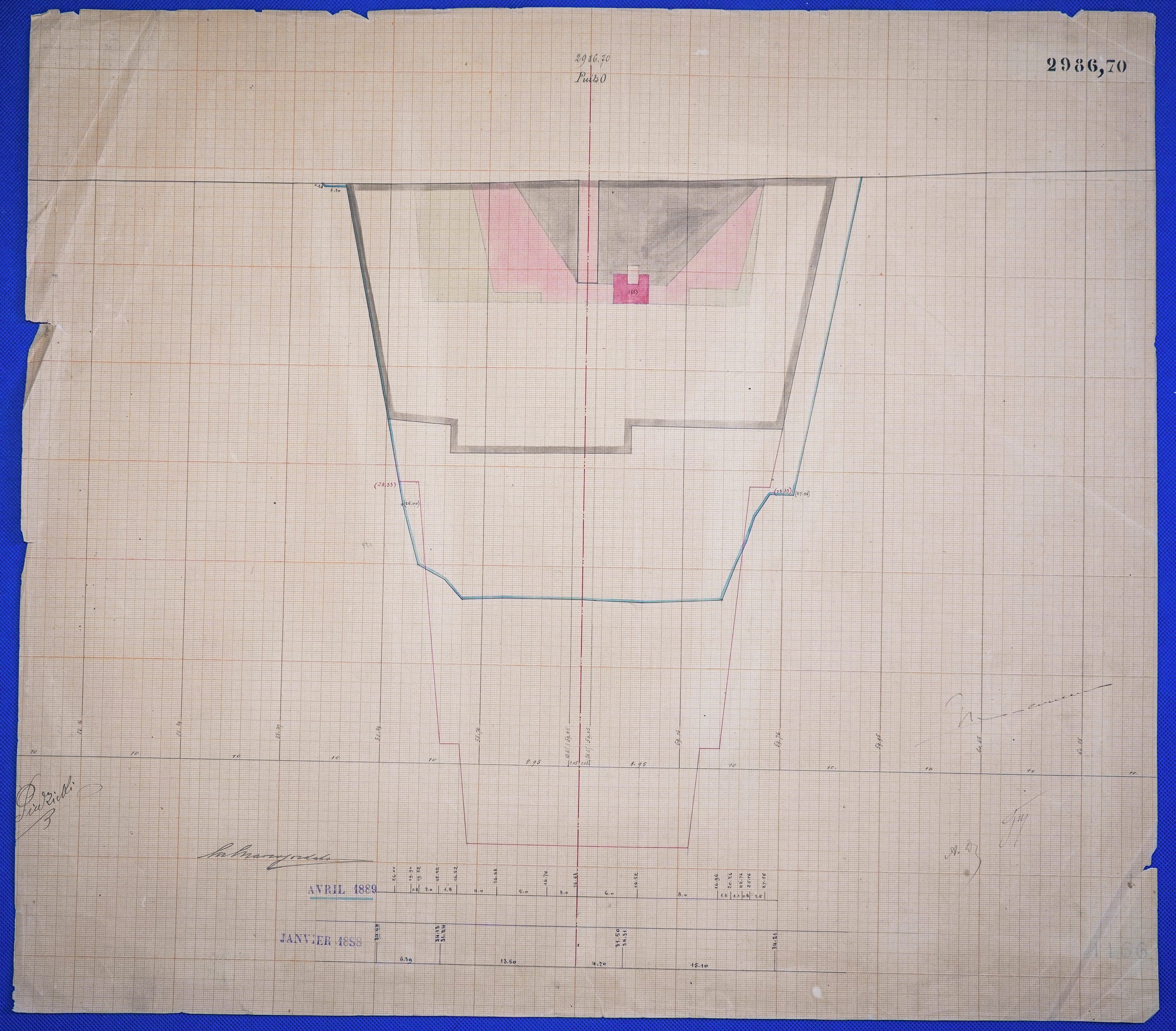 - Έγχρωμο σχέδιο προόδου εκσκαφικών εργασιών (μηκοτομή) χιλ. σημείου 2986,70 με μελάνι και έγχρωμο μολύβι σε χαρτί μιλιμετρέ.