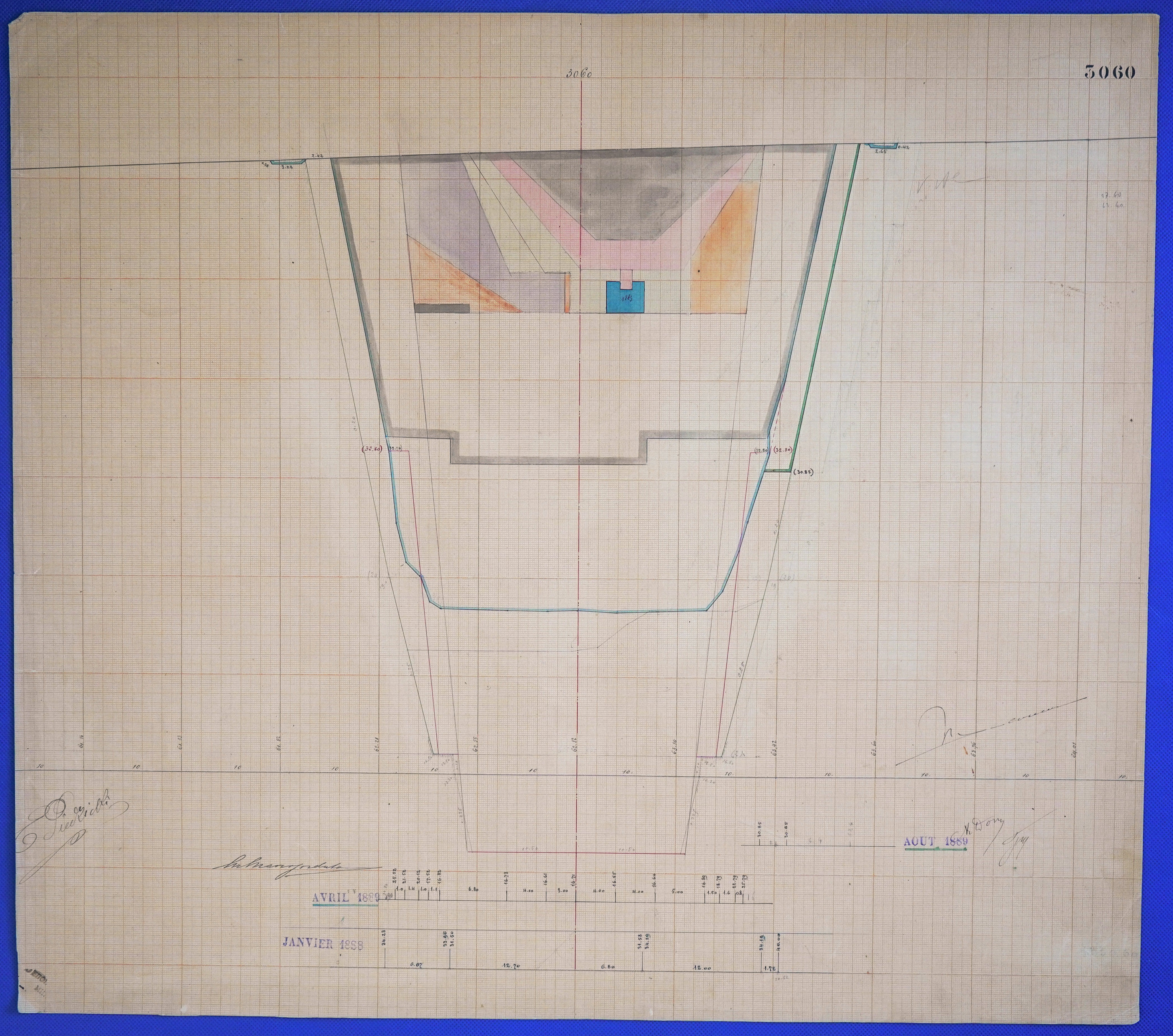 - Έγχρωμο σχέδιο προόδου εκσκαφικών εργασιών (μηκοτομή) χιλ. σημείου 3060 με μελάνι και έγχρωμο μολύβι σε χαρτί μιλιμετρέ.