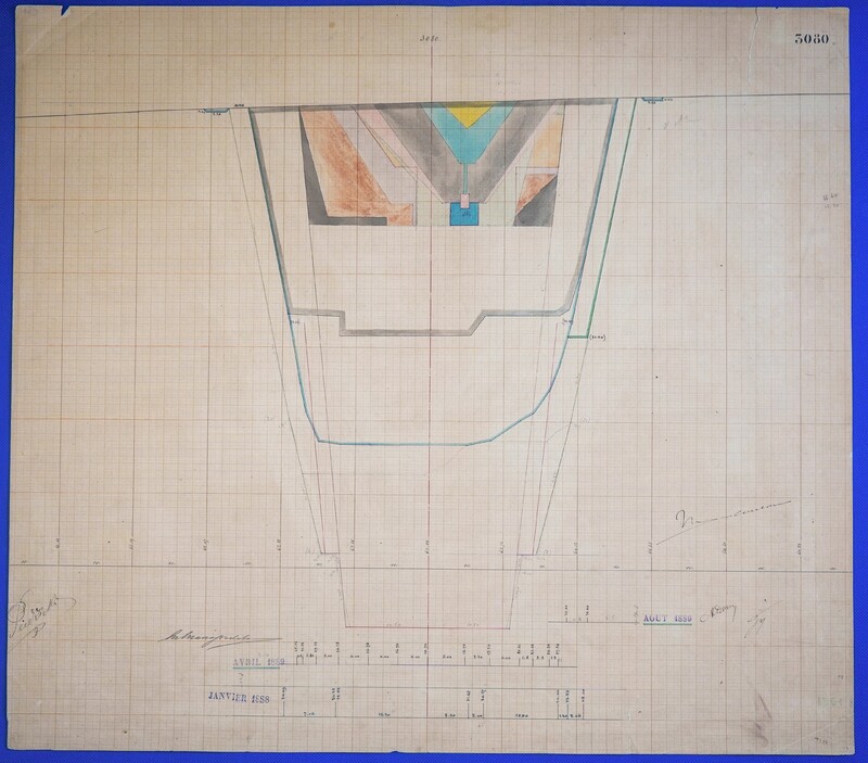 - Έγχρωμο σχέδιο προόδου εκσκαφικών εργασιών (μηκοτομή) χιλ. σημείου 3080 με μελάνι και έγχρωμο μολύβι σε χαρτί μιλιμετρέ.