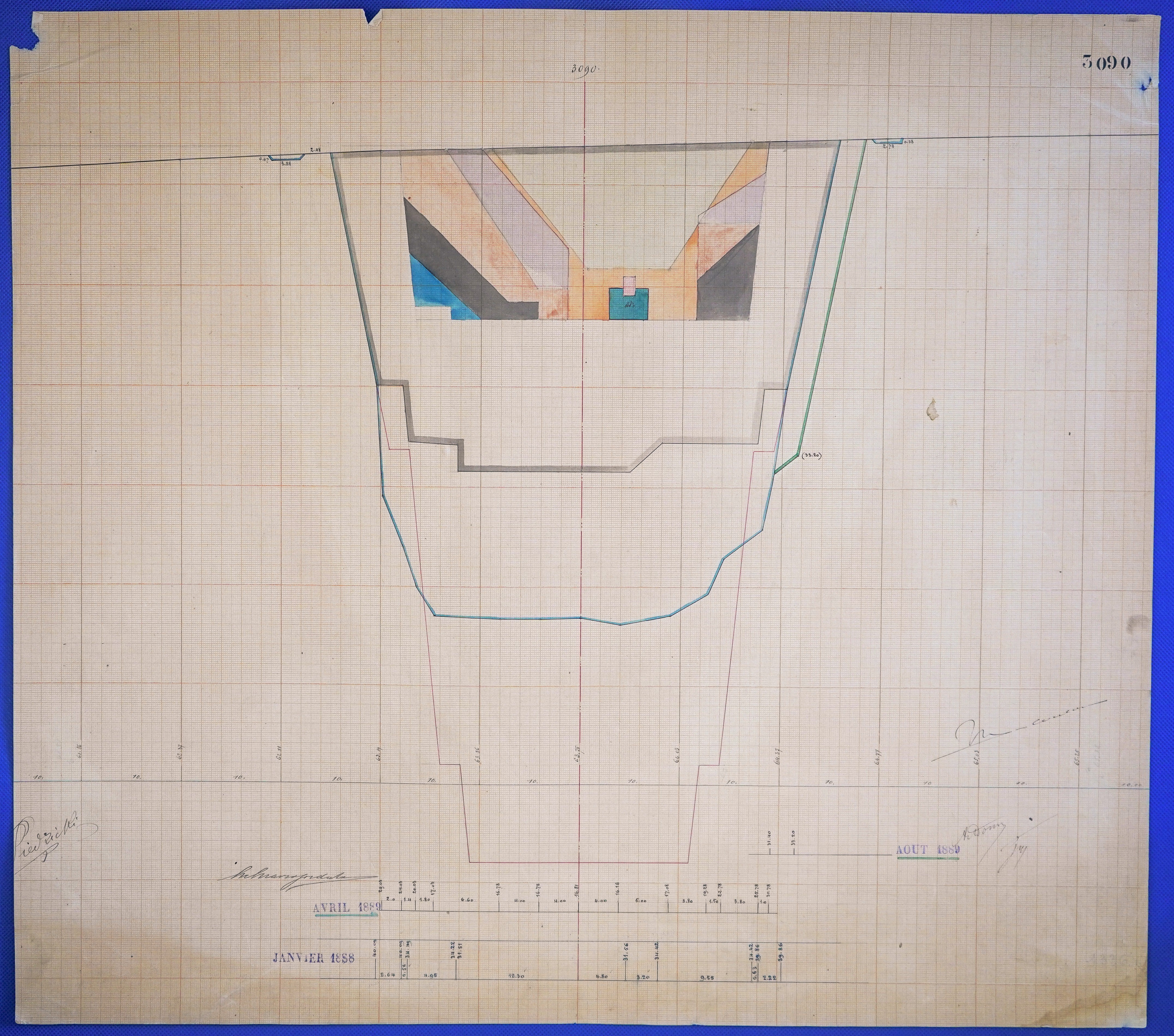 - Έγχρωμο σχέδιο προόδου εκσκαφικών εργασιών (μηκοτομή) χιλ. σημείου 3090 με μελάνι και έγχρωμο μολύβι σε χαρτί μιλιμετρέ.