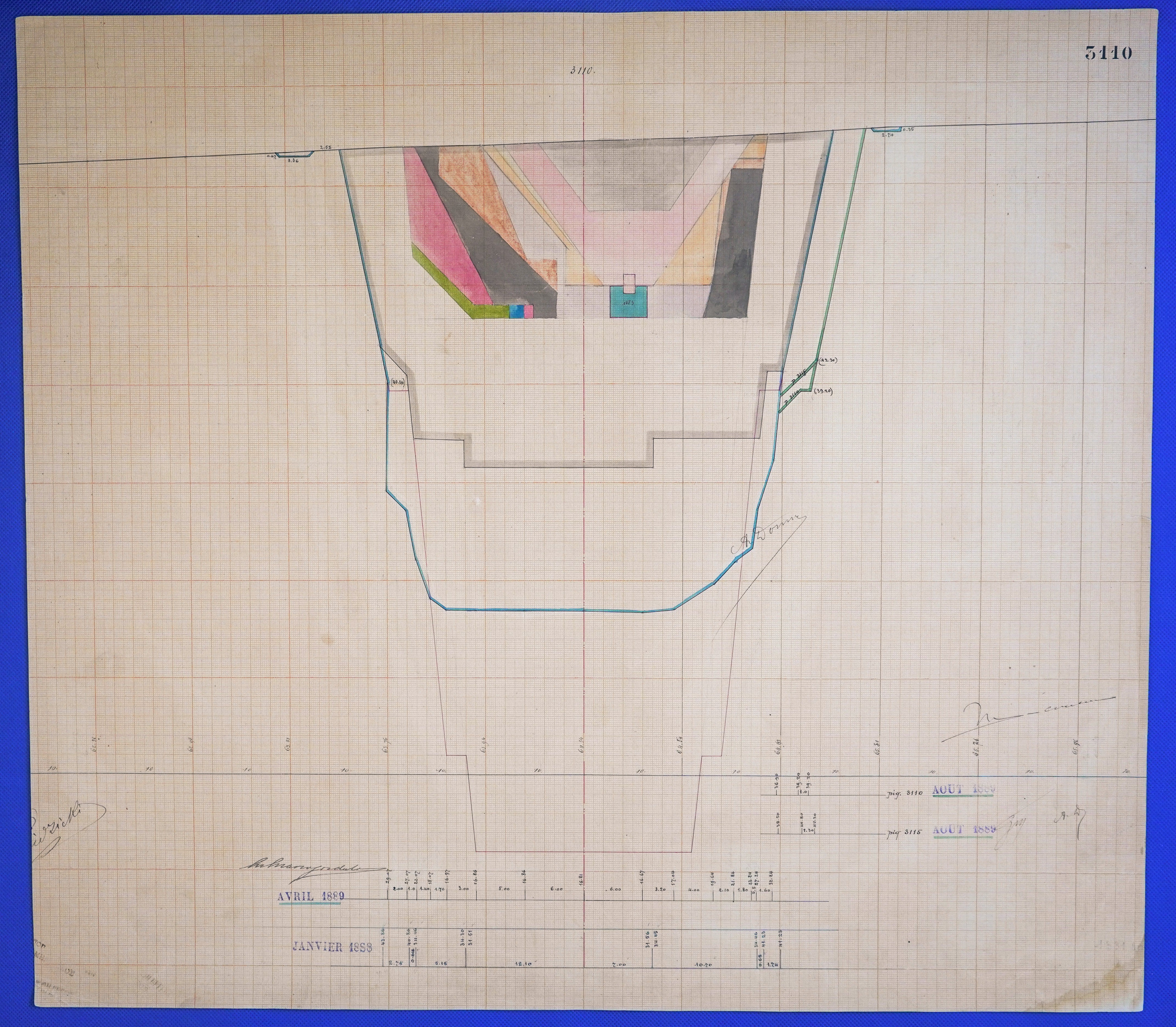 - Έγχρωμο σχέδιο προόδου εκσκαφικών εργασιών (μηκοτομή) χιλ. σημείου 3110 με μελάνι και έγχρωμο μολύβι σε χαρτί μιλιμετρέ.
