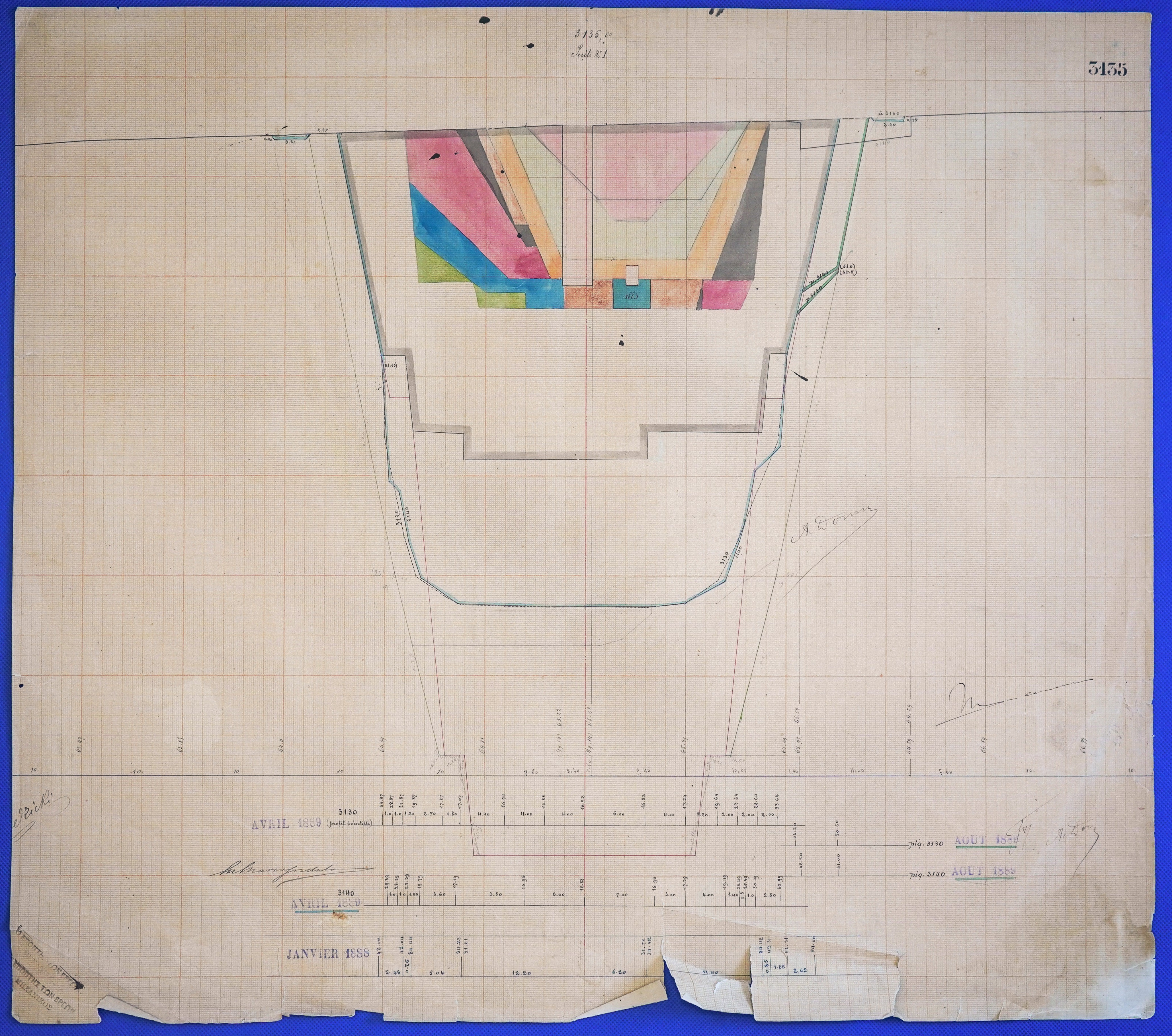 - Έγχρωμο σχέδιο προόδου εκσκαφικών εργασιών (μηκοτομή) χιλ. σημείου 3135 με μελάνι και έγχρωμο μολύβι σε χαρτί μιλιμετρέ.